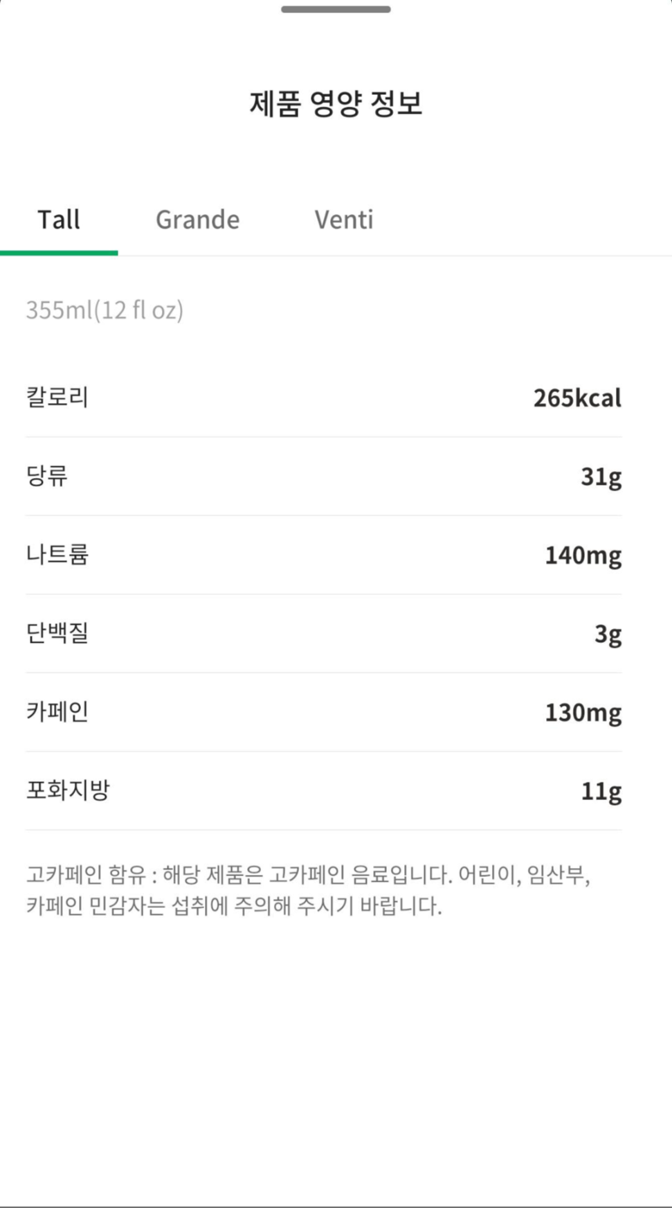 칼로리는 265kcal 에스프레소를 2샷이나 넣었으니 당연히 고카페인 음료이다.