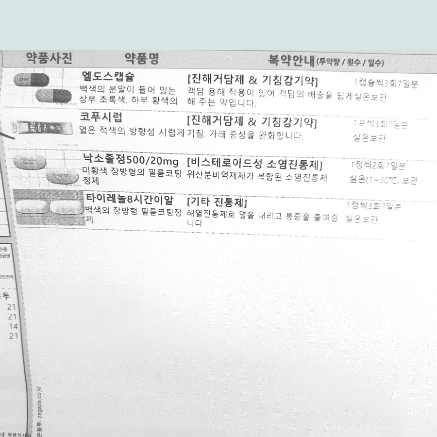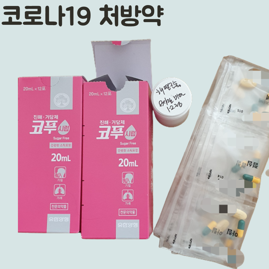 확진 후 있는 증상을 얘기하고 코푸시럽, 타이레놀이알,엘도스캡슐, 낙소졸정을 처방받았다.