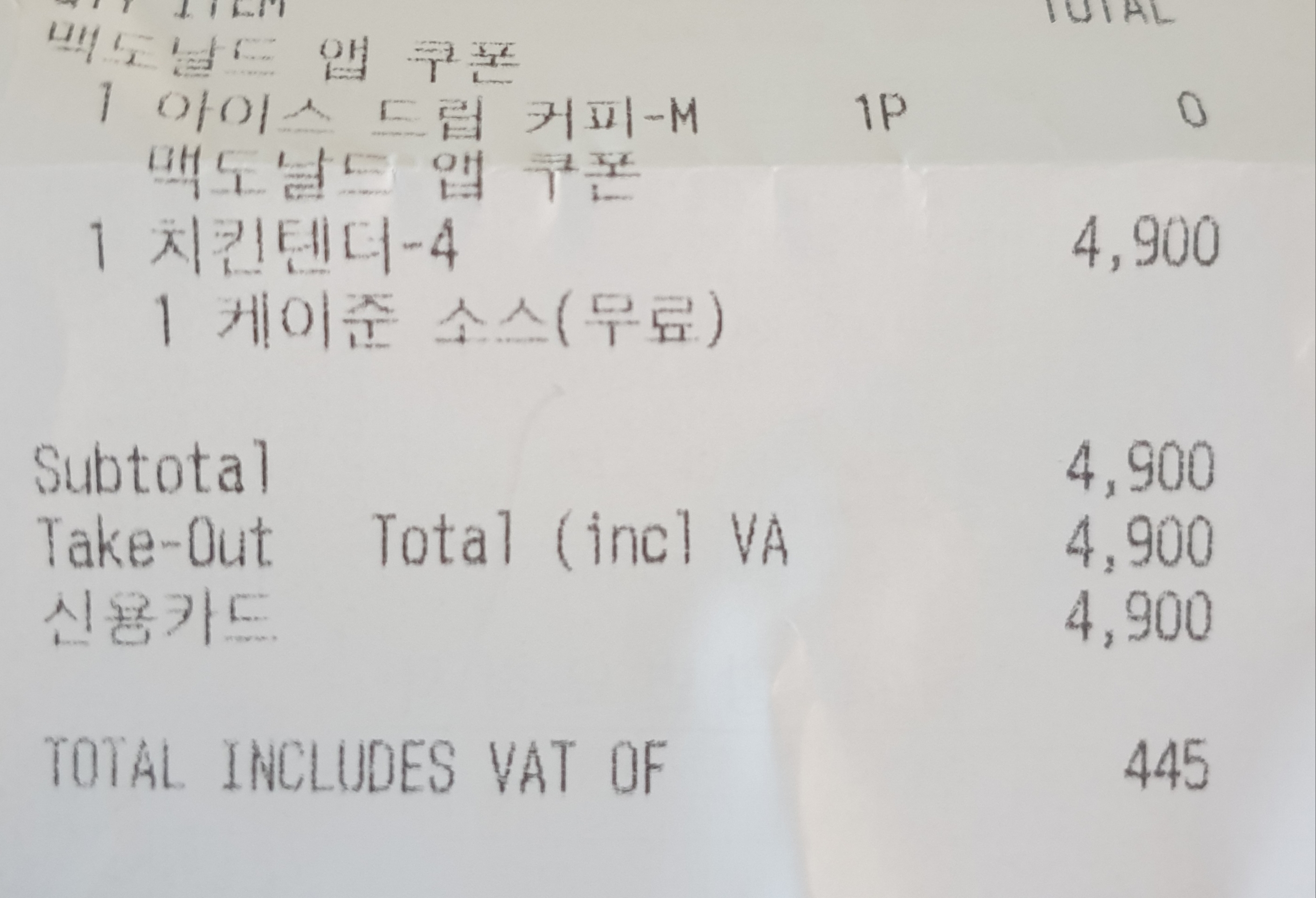 간식으로 맥도날드에서 맥스파이시 치킨텐더를 샀다. 맥도날드 치킨텐더 가격은 4조각에 4,900원이었다. 그리고 맥도날드 앱 설문조사를 하고 무료커피쿠폰을 받아서 아이스 드립 커피를 같이 주문했다.