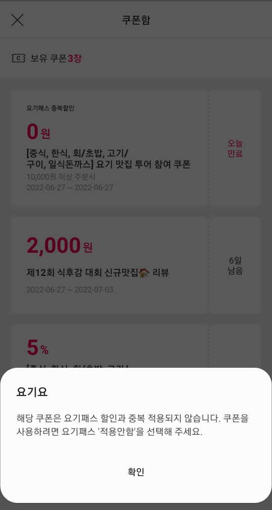 신규맛집에 #식후감 이렇게 쓰기만 하면 2천원 할인되는 식후감 쿠폰을 주는데 이제 요기패스랑 중복할인이 안된다.