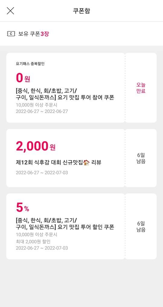 회원 등급에 따라 주는 쿠폰도 없어졌다. 16번이상 시키면 2,000원 할인쿠폰 두 장씩 줬었는데 6월부터는 쿠폰도 안 주고 등급제도를 개편했다. 점점 줄어드는 혜택이 별로고 스마일클럽 배달할인이랑 별 차이를 못 느껴서 그냥 해지했다. 요기요는 맛집이 없고 맛집은 배민에 있어서 요기요에서 시킬 수 있는 곳은 치킨,햄버거,피자,떡볶이,파바같은 프랜차이즈 밖에 없었는데 여기는 직접 가서 살 수 있는 거리에 있다. 배달비 안 내고 직접 가서 포장해오는게 낫다는 결론이다.