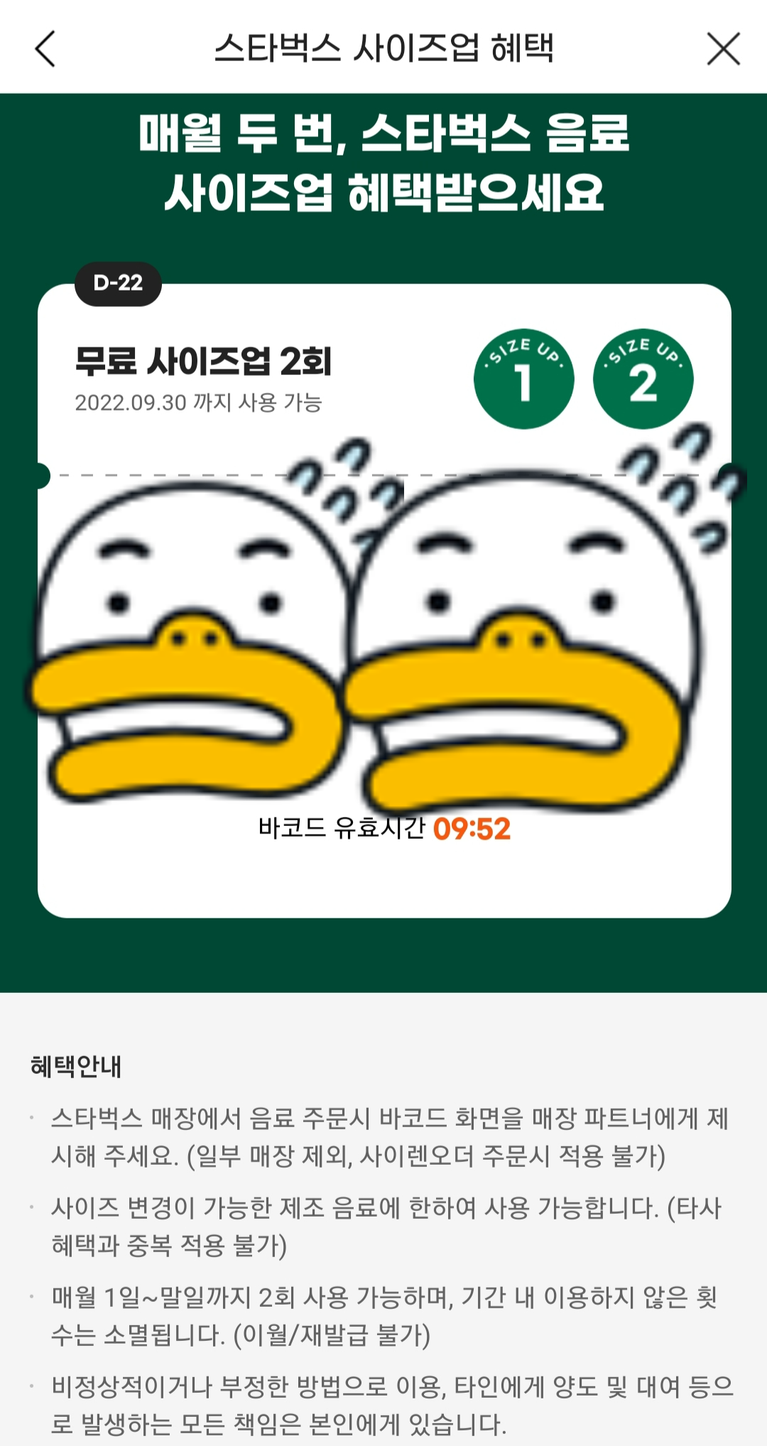 배너를 클릭하면 스타벅스 사이즈업 2회 무료 바코드가 뜬다.