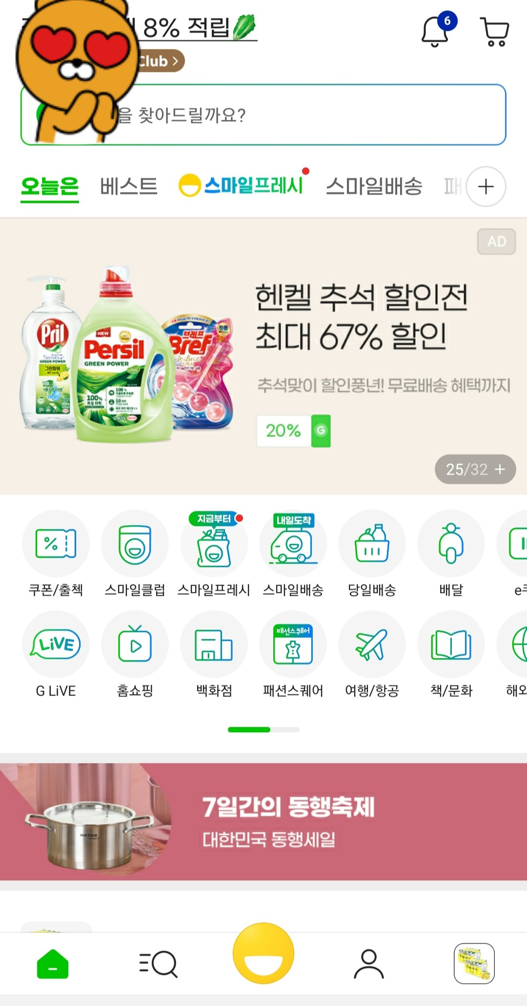 사이즈업을 사용하려면 지마켓 어플에 들어가서 아래에 있는 노란색 스마일 버튼을 누른다.