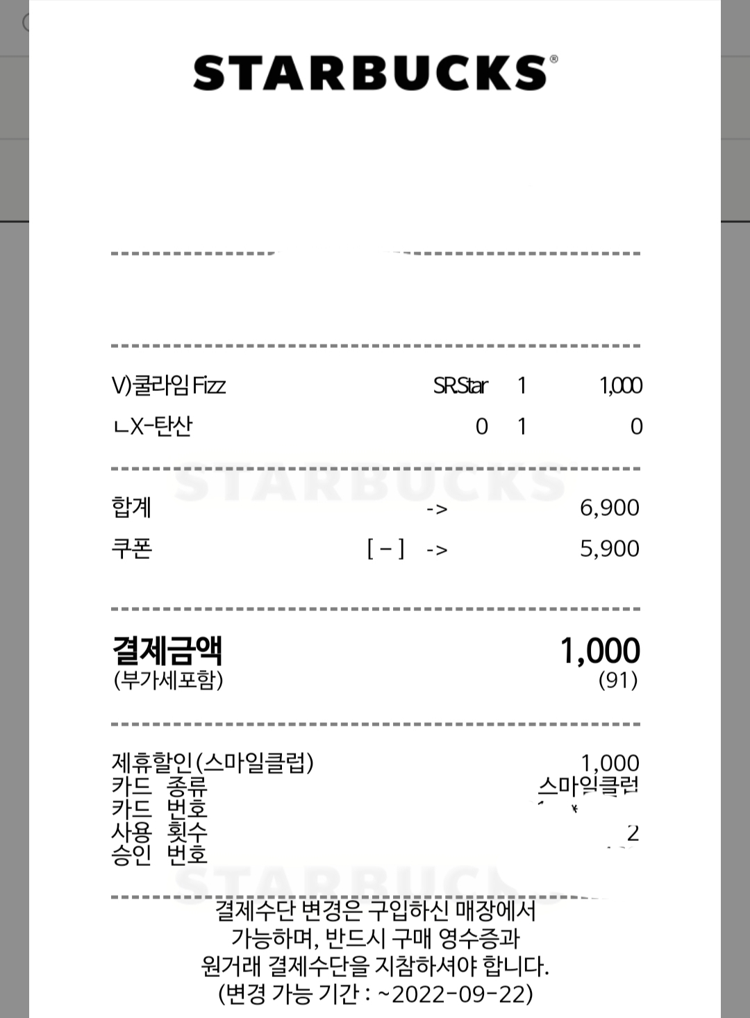 나는 스타벅스에서 톨 사이즈 무료 음료 쿠폰을 사용했고 스마일클럽 사이즈업 무료 2회를 사용해서 벤티 사이즈의 음료를