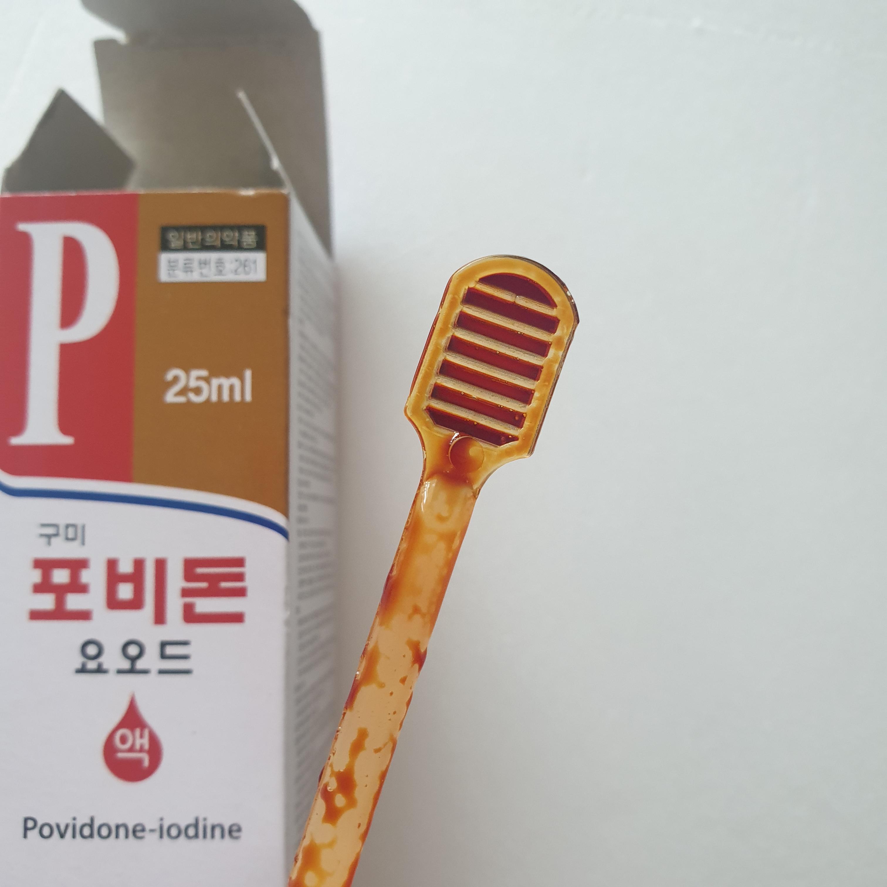 포비돈 스틱이라는 면봉에 빨간약이 뭍혀서 나오는 것도 있는데 이 용액을 쓰다 버리는 게 더 저렴할 것 같아서 그냥 이걸로 샀다.