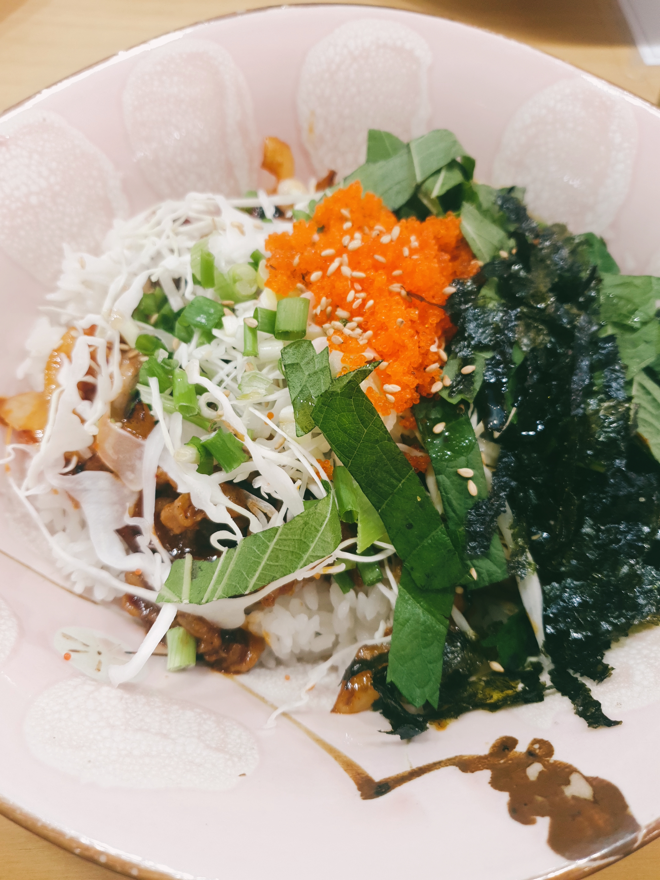 가격은 8,000원이고 매운 양념에 볶은 소고기와 낙지, 날치알, 양배추 조금, 깻잎, 김가루, 날치알로 만든 메뉴이다.