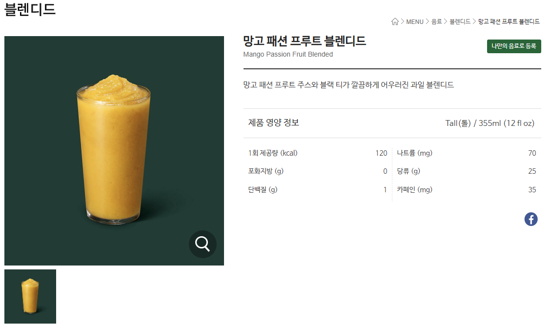 망고패션 프루트 영양정보(출처: 스타벅스 홈페이지)