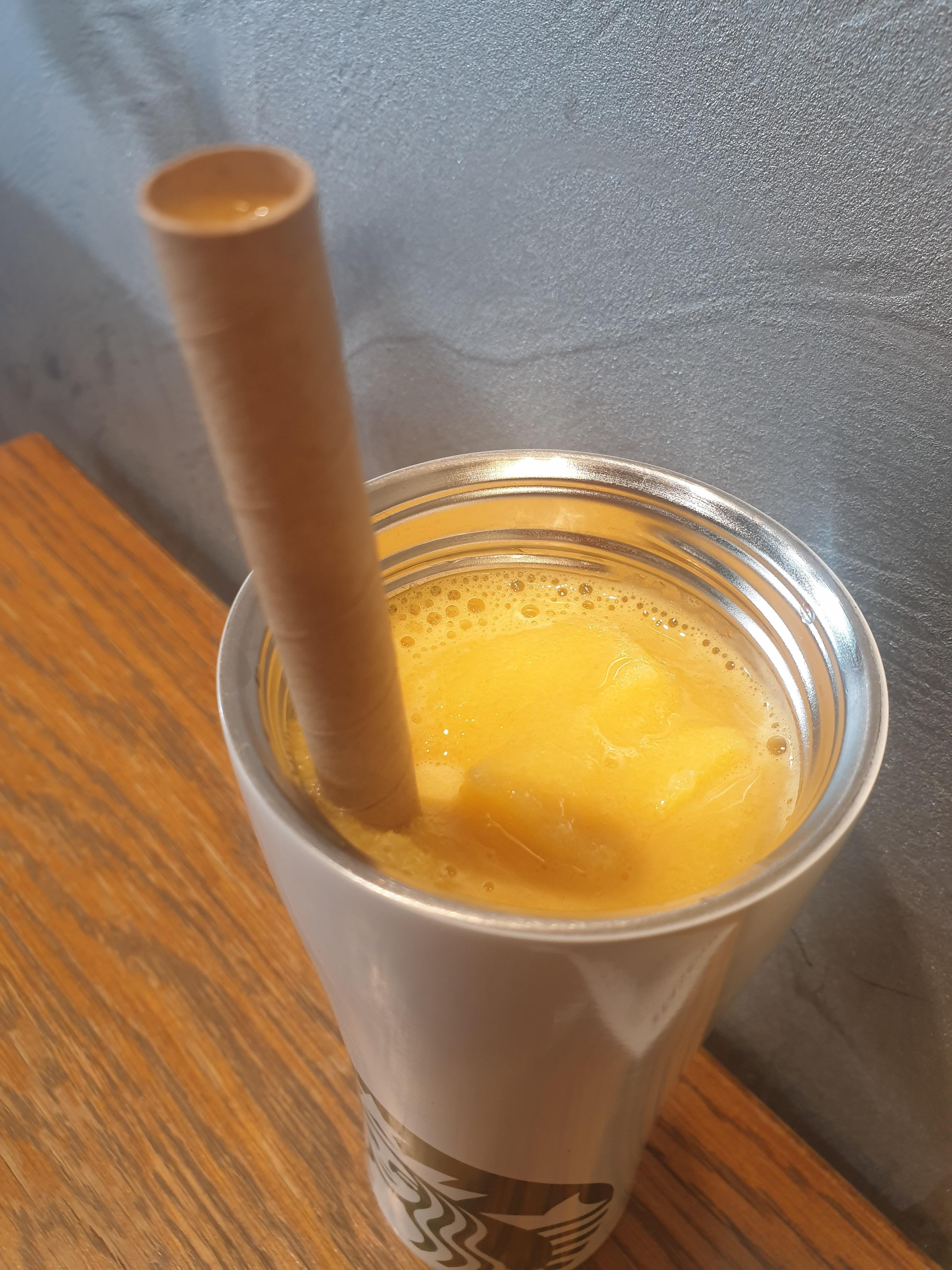 망고패션프루트 블렌디드 맛은 첫 맛은 패션프루트랑 티 맛이 나고 끝맛에 망고맛이 났다.