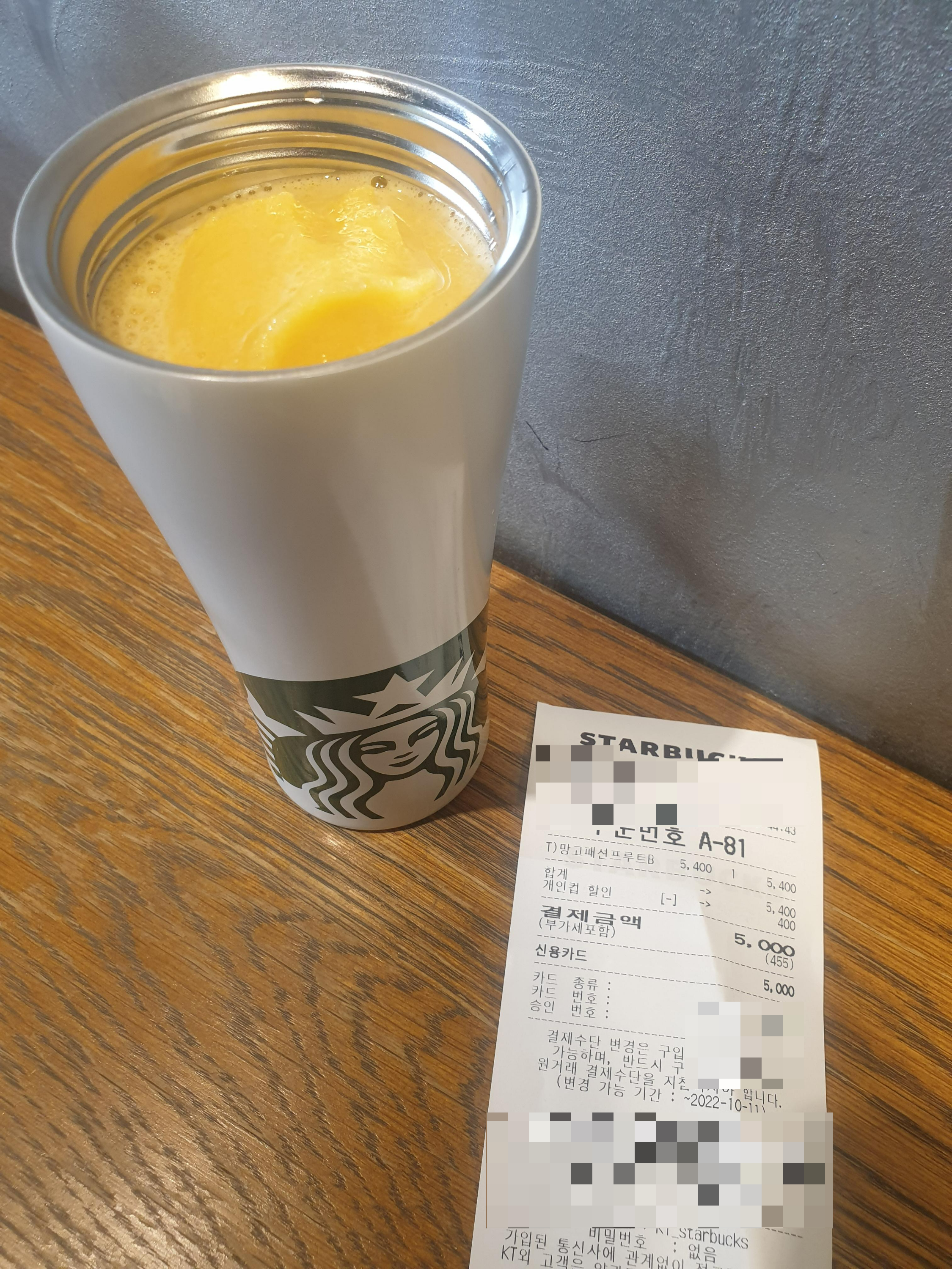 망고패션프루트블렌디드 가격은 5,400원(톨 사이즈)이었는데 텀블러 할인 400원을 받아 5,000원이었다.