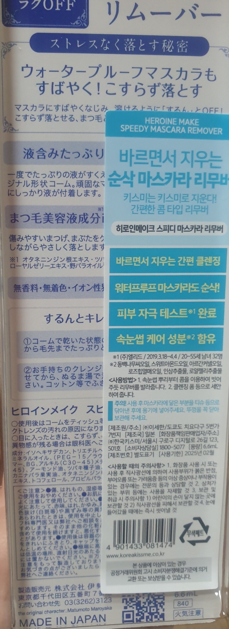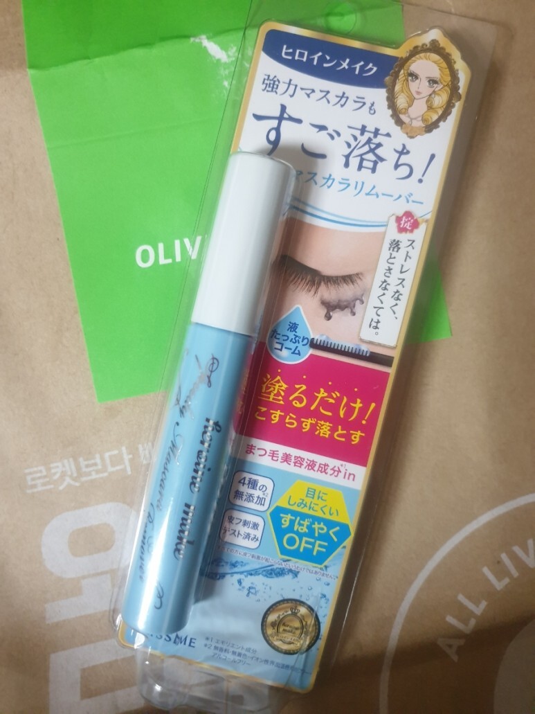 그렇기 때문에 일반 아이리무버나 클렌징워터로 지우는 건 잘 지워지는 느낌이 안 드는데 올리브영에서 파는 키스미 히로인메이크 스피디 마스카라 리무버 NN을 사용하고 있다. 가격은 현재 9,100원이로 저렴하다.