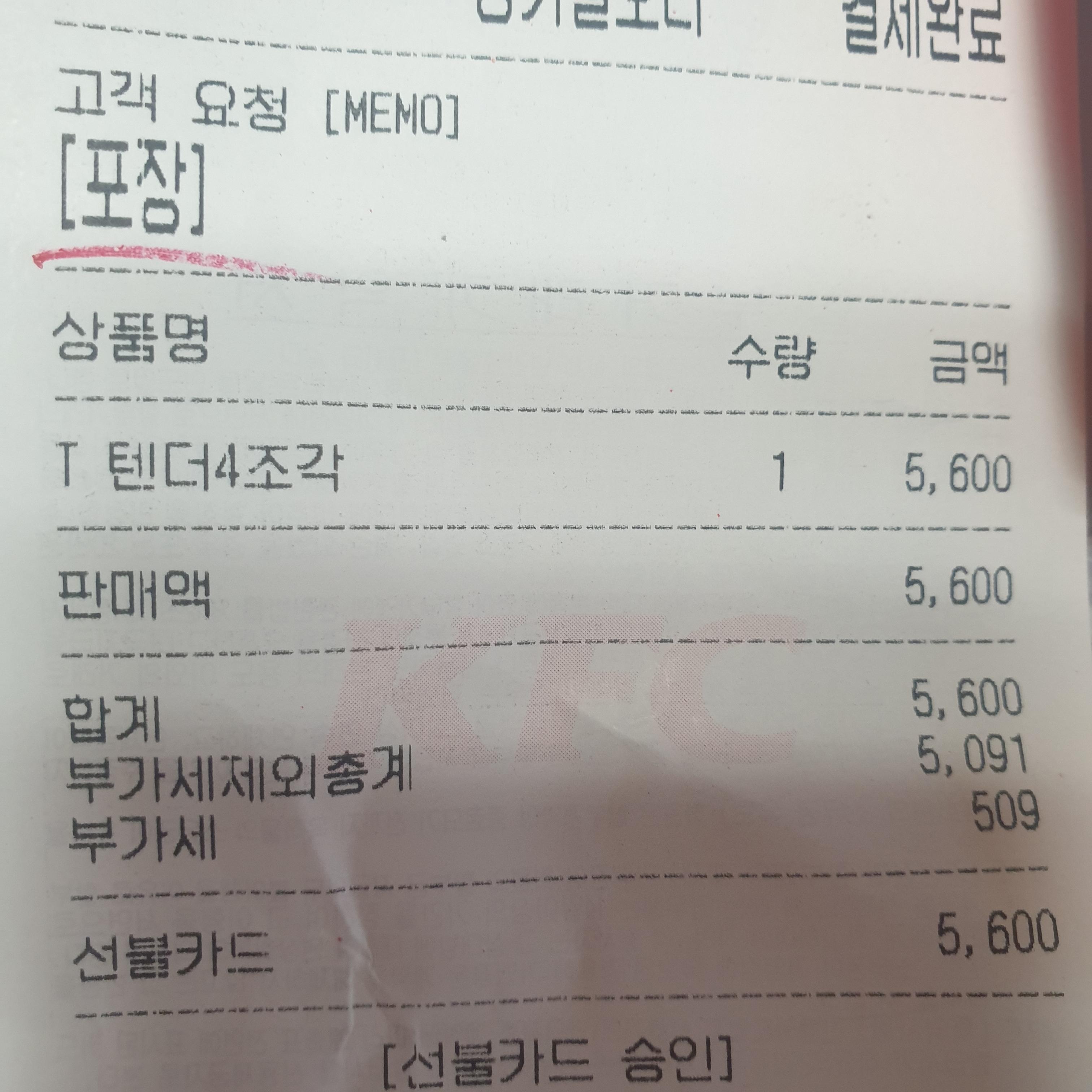 텐더는 2조각, 4조각을 팔고 있었는데 2조각은 2,900원이었고 4조각은 5,600원이었다.