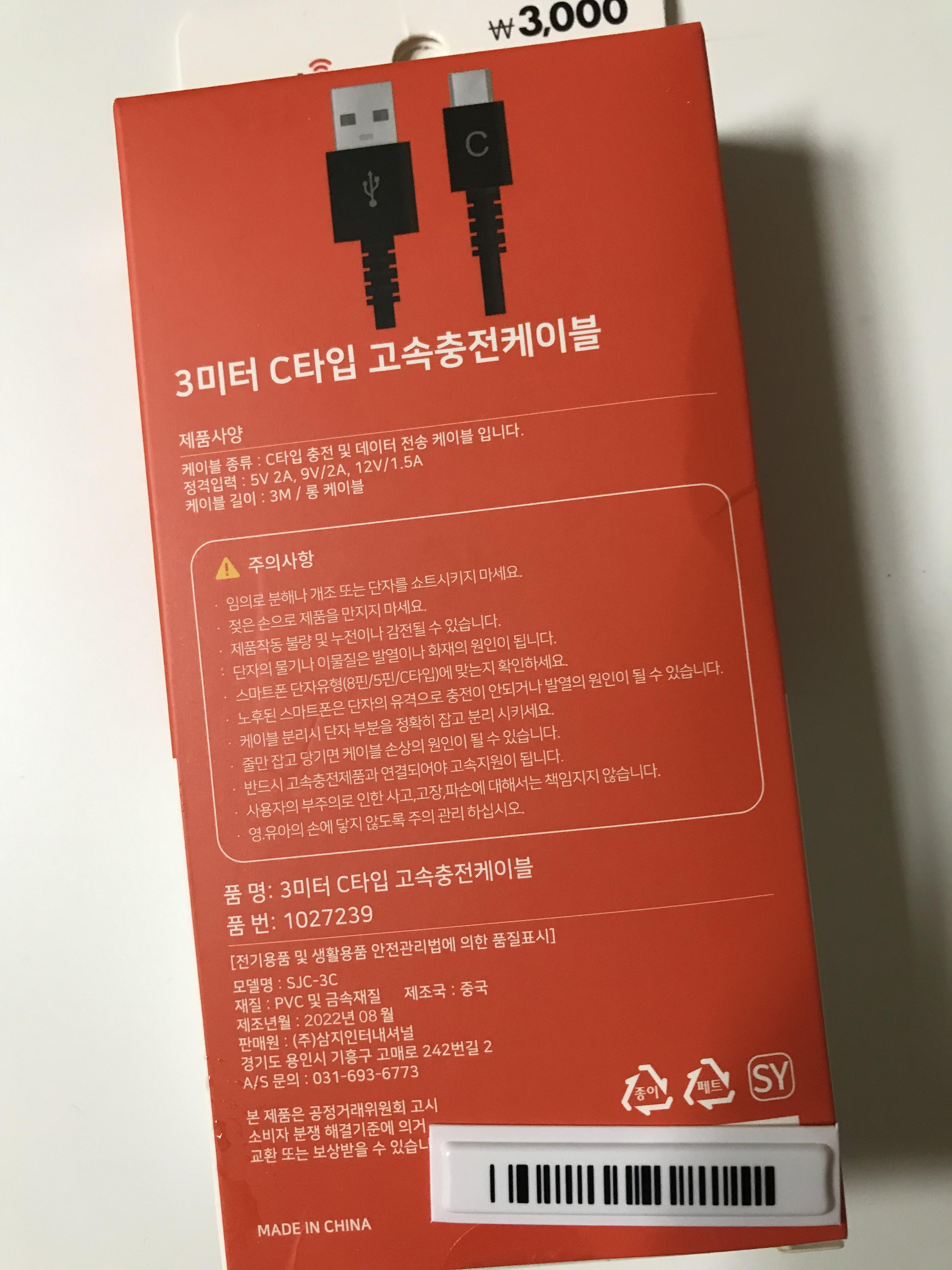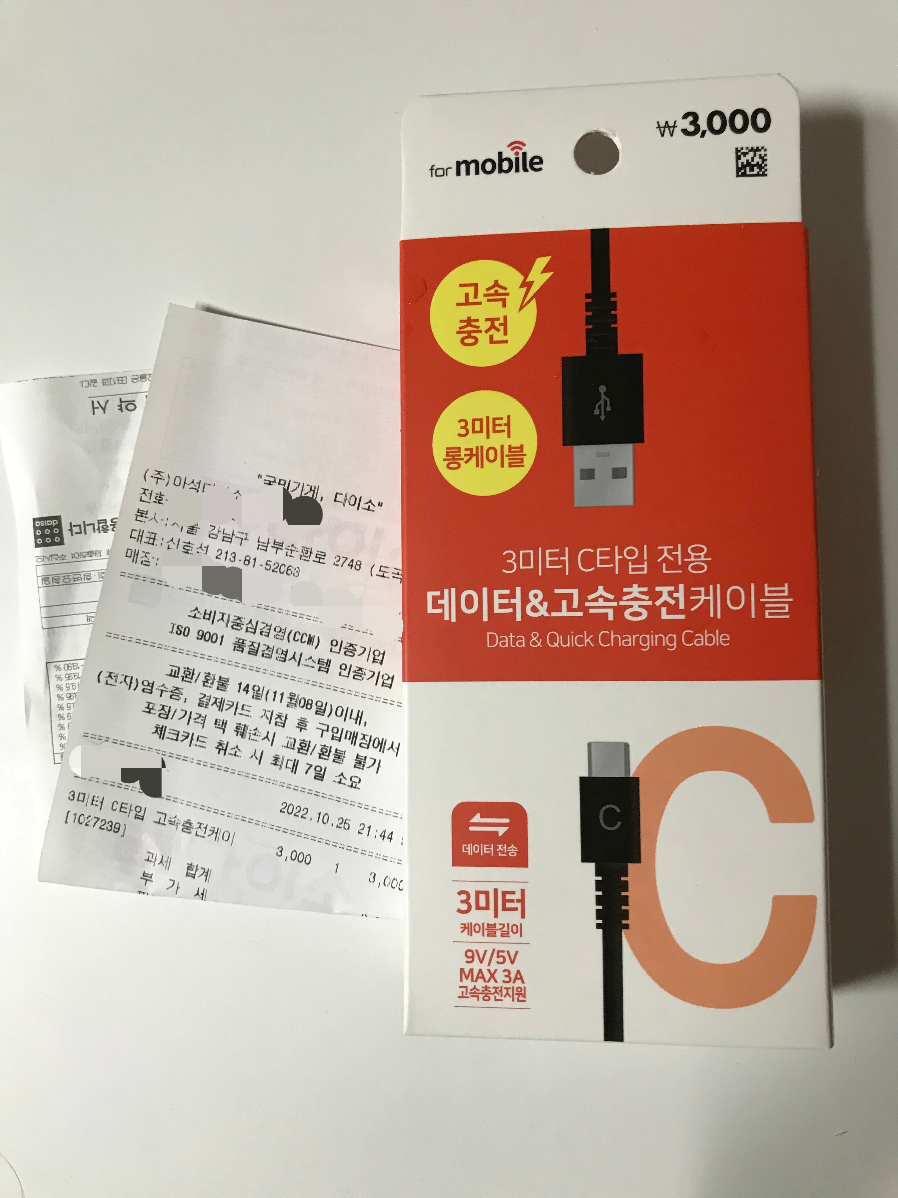 내가 고른 건 3미터 C타입 전용 데이터&고속충전케이블이고 품번은 1027239였고 가격은 3,000원이었다.