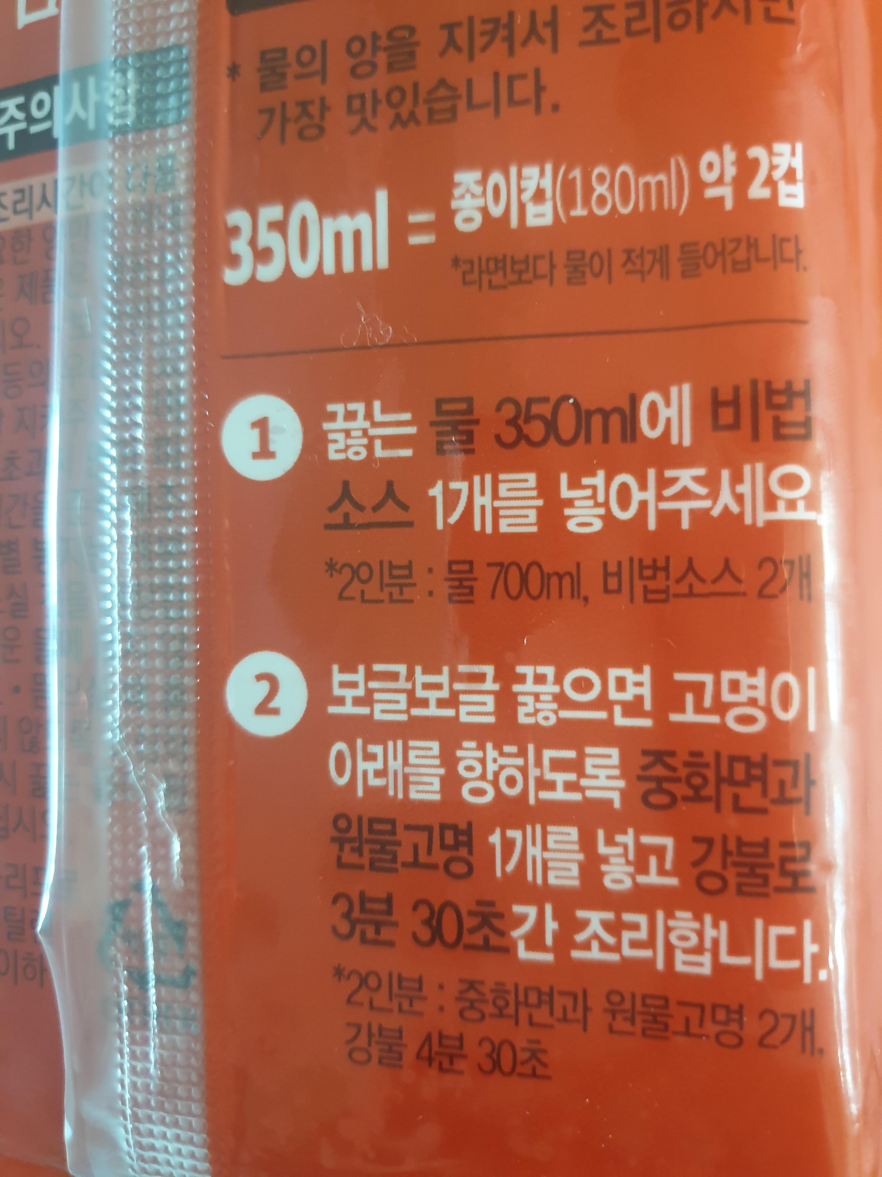 끓는 물 350ml에 비법 소스 1개를 넣고 고명이 아래를 향하도록 중화면과 원물 고명 1개를 넣고 강불로 3분 30초간 조리하기.