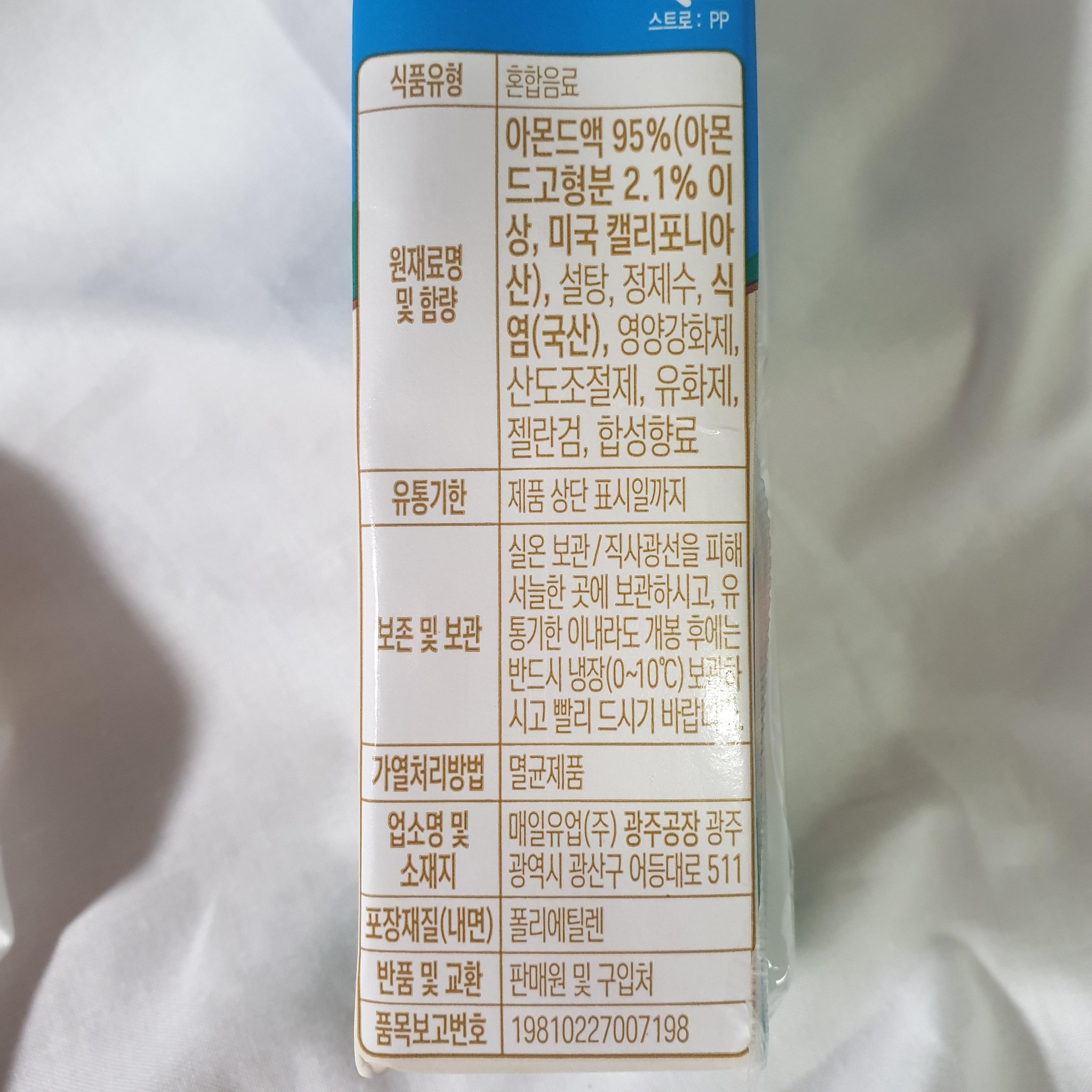 아몬드액, 설탕, 정제수, 식염, 영양강화제, 산도조절제, 유화제, 젤란검, 합성향료로 구성되어 있다.