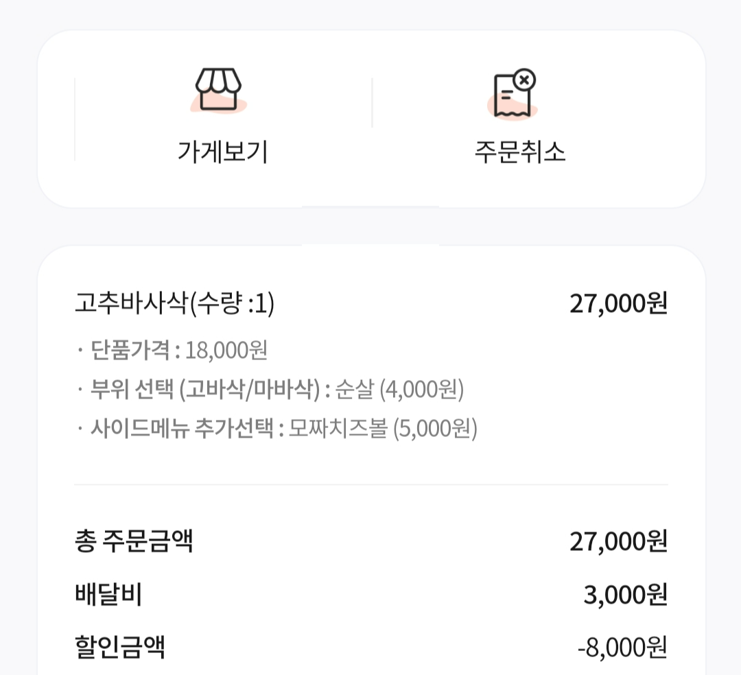 고추바사삭 가격은 18, 000원었는데 뼈 버리기가 귀찮아서 고추 바사삭 순살로 변경하니 4,000원이 추가되었다.