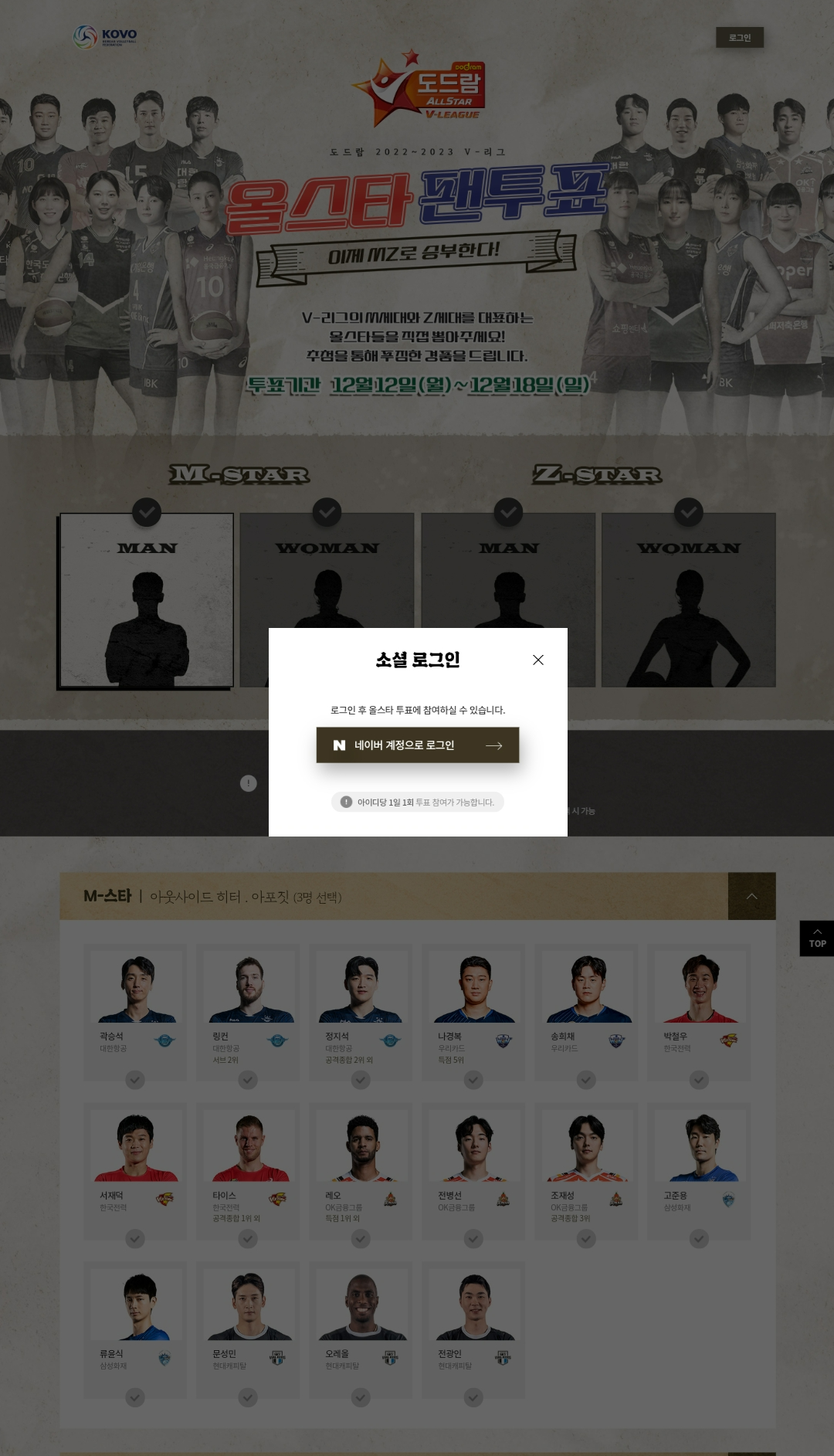 암튼 배구 올스타전은 여자배구랑 남자배구 선수를 둘다 뽑아야 하고 네이버 아이디로 하루에 한번씩 뽑을 수 있다.