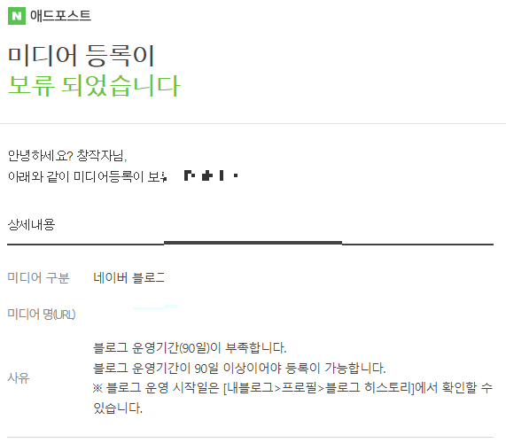 네이버블로그 애드포스트 실패 원인은 블로그 운영기간인 90일이 아직 안되었기 때문이었다.
