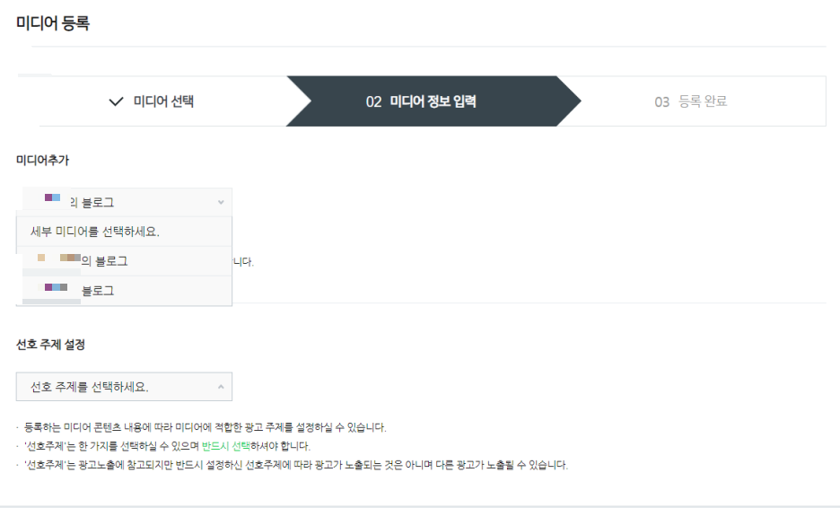 애드포스트 계정이 이미 있다면 처음 가입한 계정으로 들어가서 애드포스트에서 미디어 등록, 미디어 추가에서 원하는 매체를 선택하고 선호 주제를 설정하고 승인여부를 기다리면 된다.