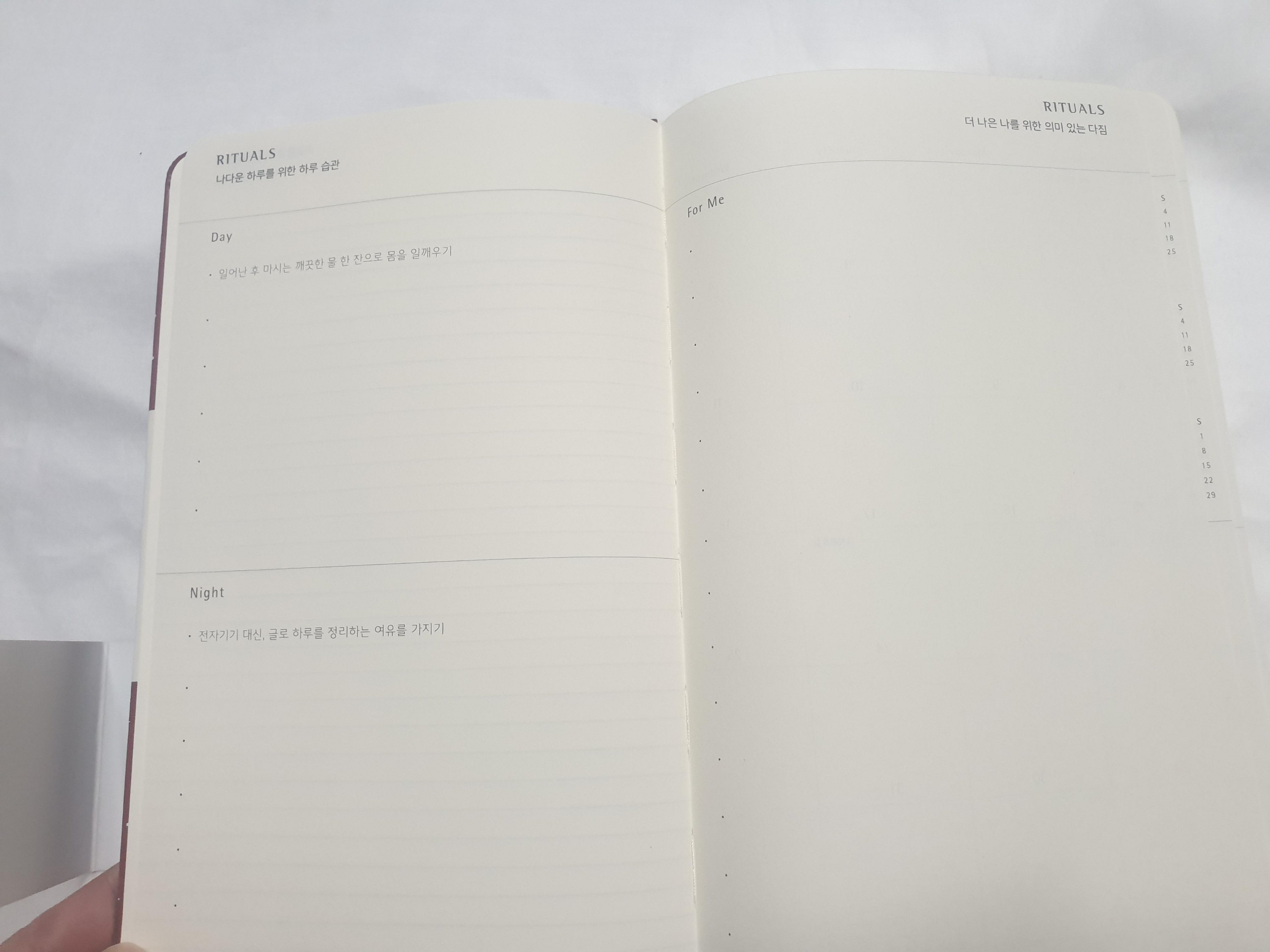 라이프저널과 리추얼 플래너 중에서 플래너를 고른 이유는 라이프저널 속지가 별로였기 때문이다. 구체적인 경험을 종이에 기록하는 걸 좋아하지 않는 나에겐 짧게 일상과 스케쥴을 적는 플래너가 더 필요했다.