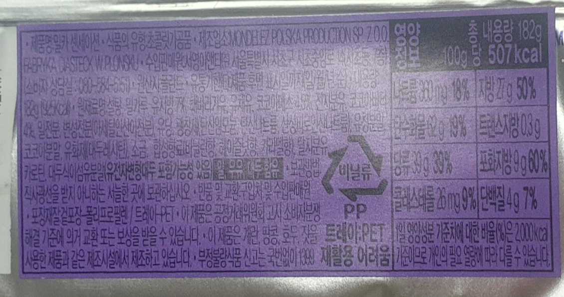 밀카 센세이션 칼로리는 100g에 507kcal라는데 개별로 환산하면 한 개에 131.82kcal이다.