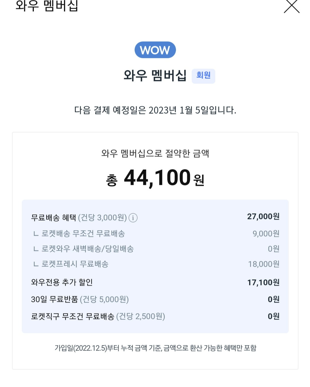 이용 현황을 확인해보니 난 로켓배송 3번, 로켓프레시를 6번 시켰고 와우회원 추가 할인 혜택을 받았다.