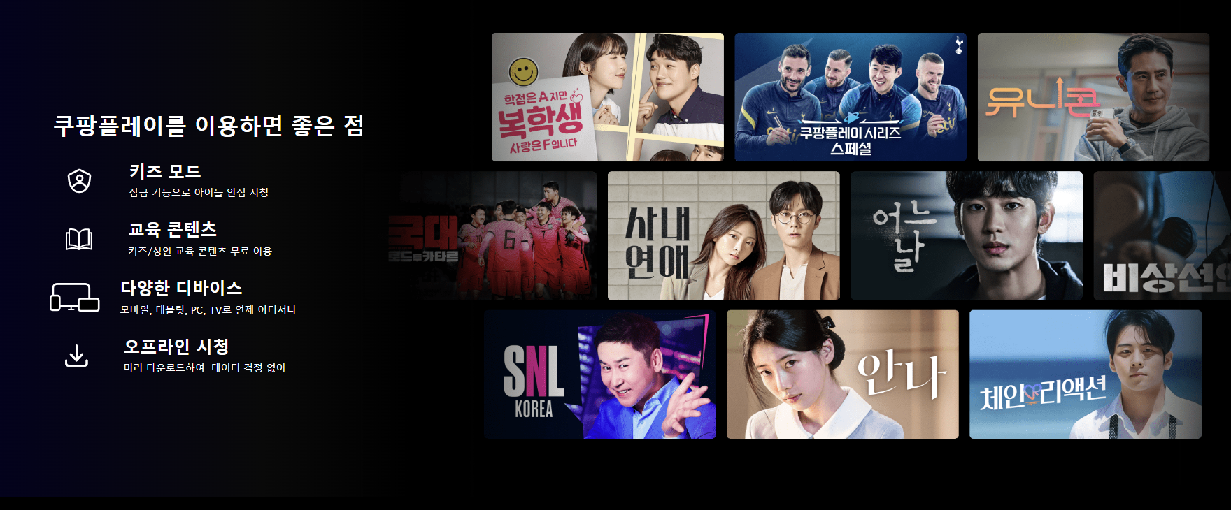 쿠팡 플레이는 키즈모드, 교육 콘텐츠를 이용할 수 있고 모바일,태블릿, PC, TV로도 볼 수 있었다.