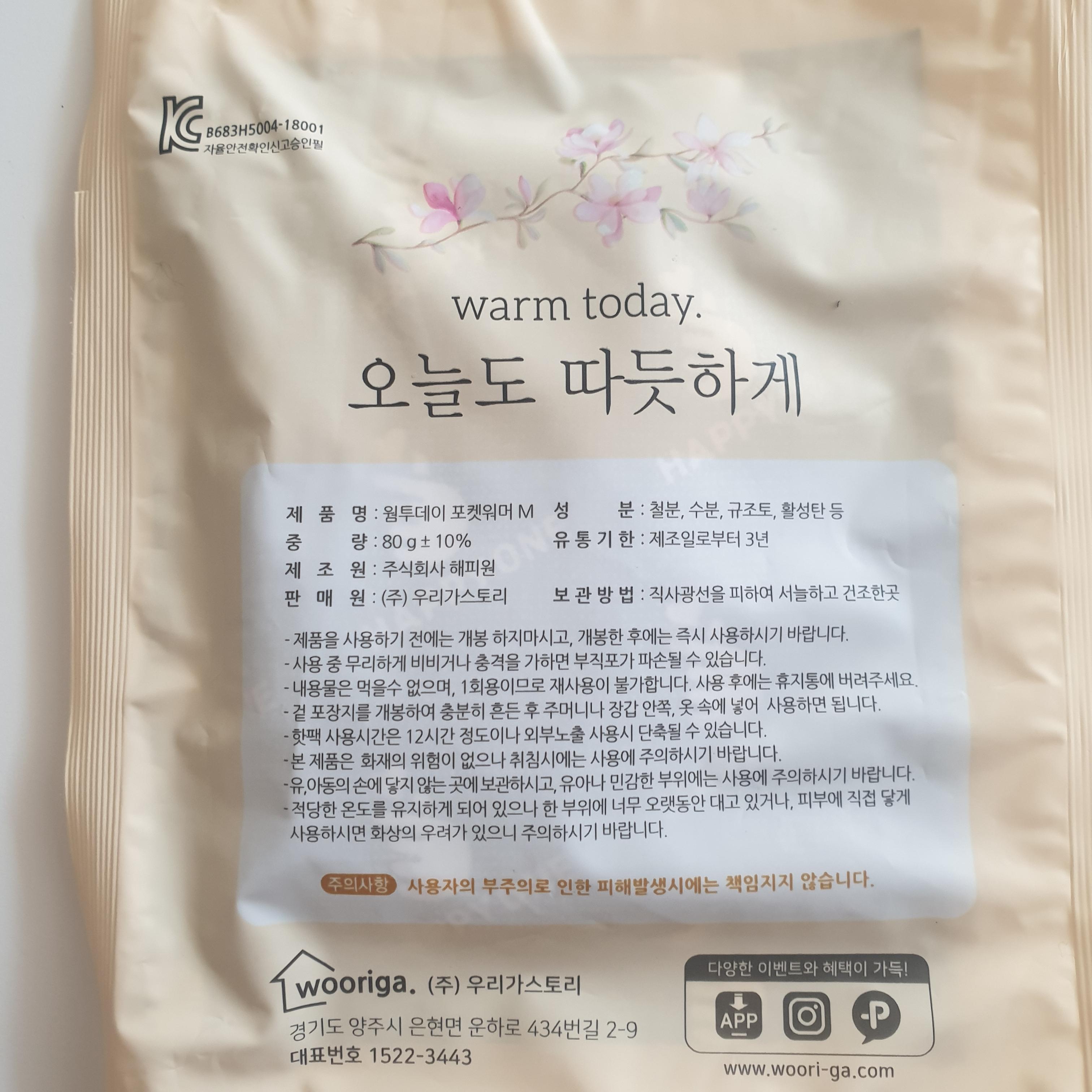 이 핫팩은 국내생산제품이고 우리가스토리에서 판매하는 오늘도 따듯하게 포켓워머 M이다.