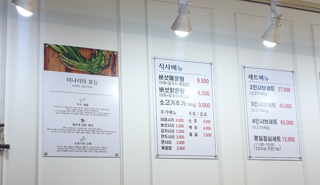 평일 점심세트 가격은 1인 12,000원이었고 2인이상부터 주문이 가능했고 야채, 고기, 칼국수, 볶음밥으로 구성되어 있다.