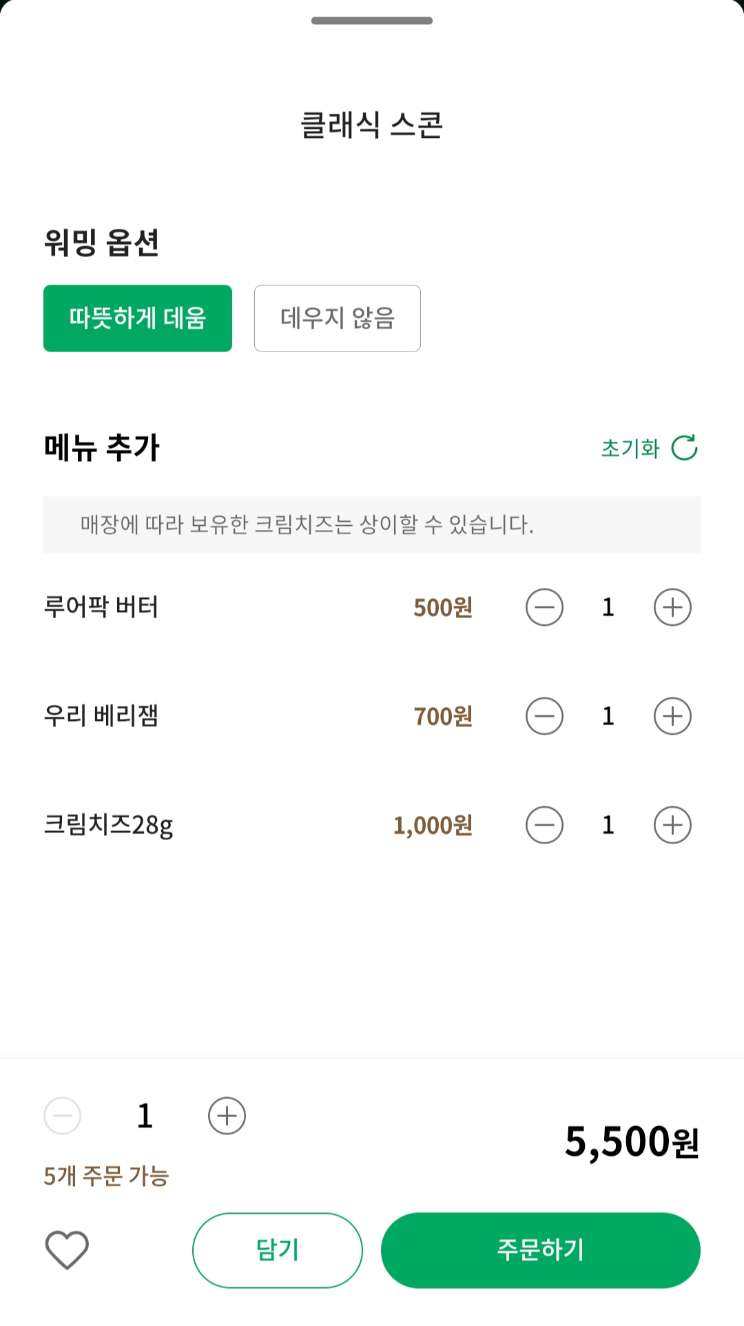 스콘을 데울지 따뜻하게 데움, 데우지 않음 을 선택할 수 있고 버터, 잼, 크림치즈를 추가할 수 있는데 버터는 500원, 잼은 700원, 크림치즈 28g은 1,000원이었다. 매장에 따라 크림치즈는 다를 수 있다고 한다.
