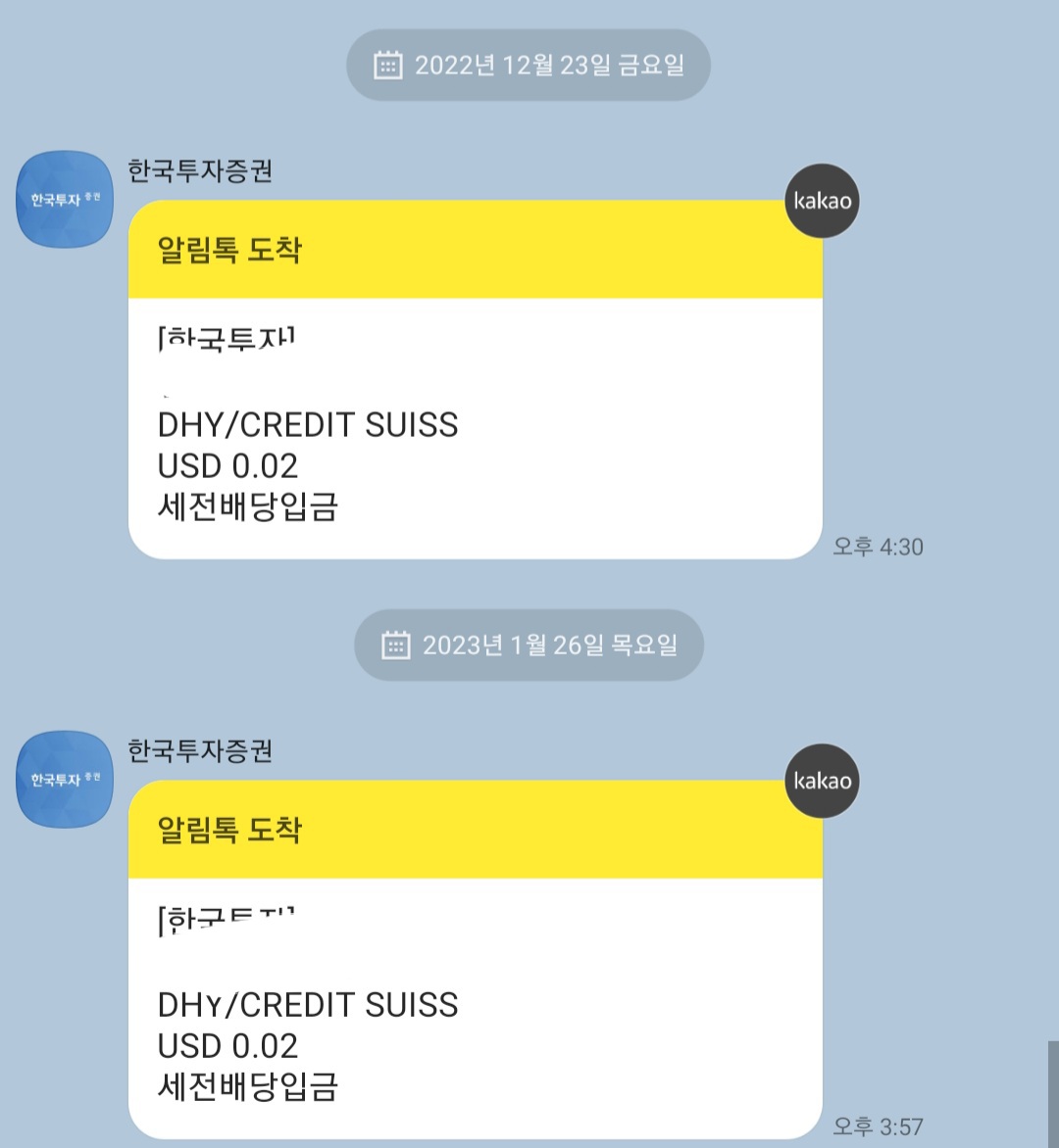 DHY/ Credit Suiss는 한국투자증권 해외계좌 개설 이벤트로 받은 건데 이거 받은 후로 주식에 대한 흥미가 급격히 감소해서 지금은 주식 어플도 업데이트를 안 했다.