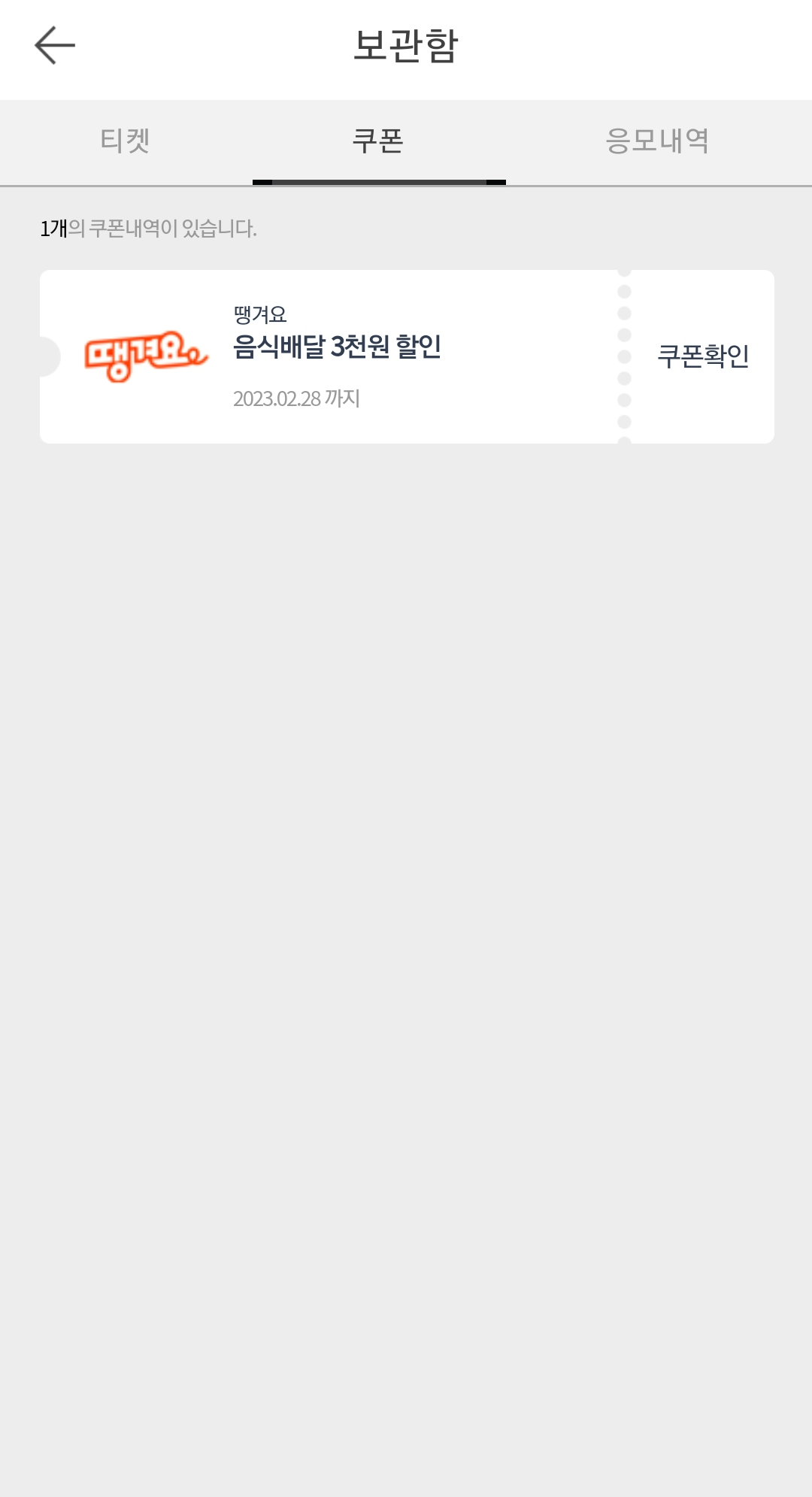받은 쿠폰은 보관함에서 번호를 복사하고 땡겨요 쿠폰함에서 쿠폰 추가를 하면 등록할 수 있다.