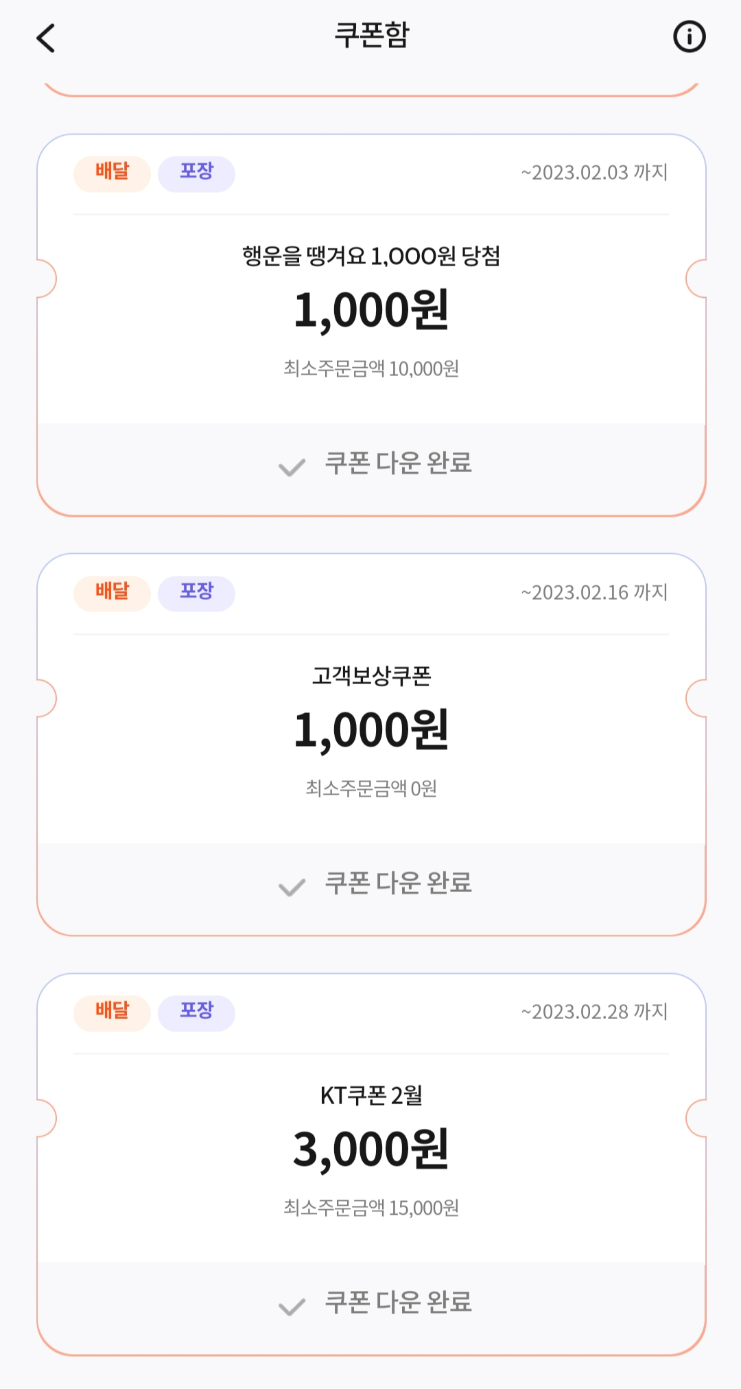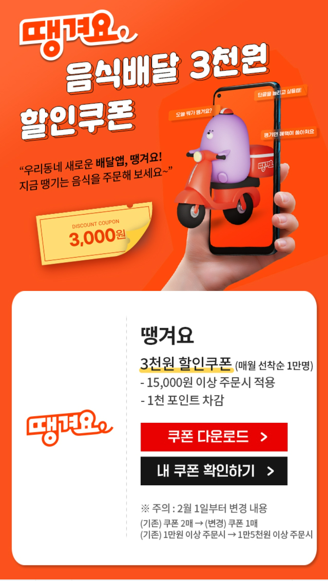 기존에는 1만 원 이상 주문하면 3천 원 할인하는 쿠폰을 두 개 줬는데 2월부터는 1만 5천 원 이상 주문해야 하고 쿠폰도 1개로 바뀌었다.