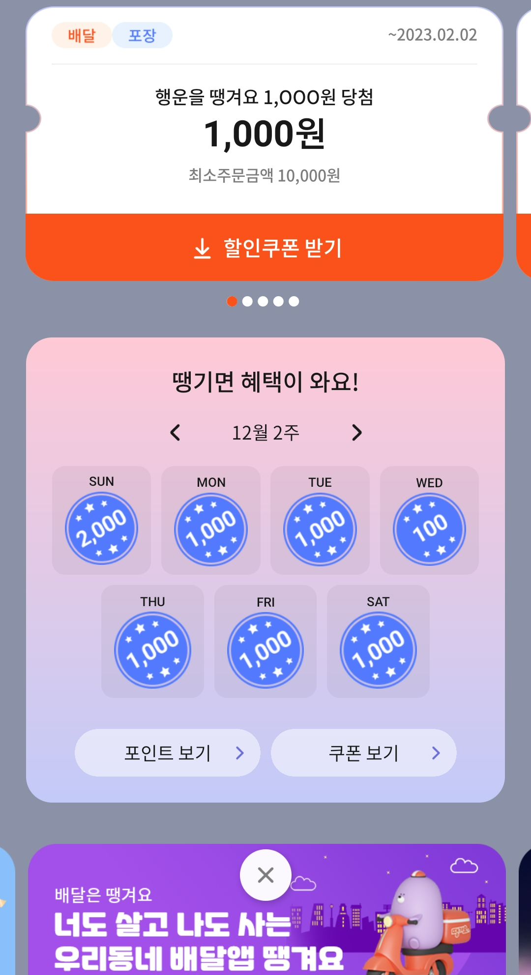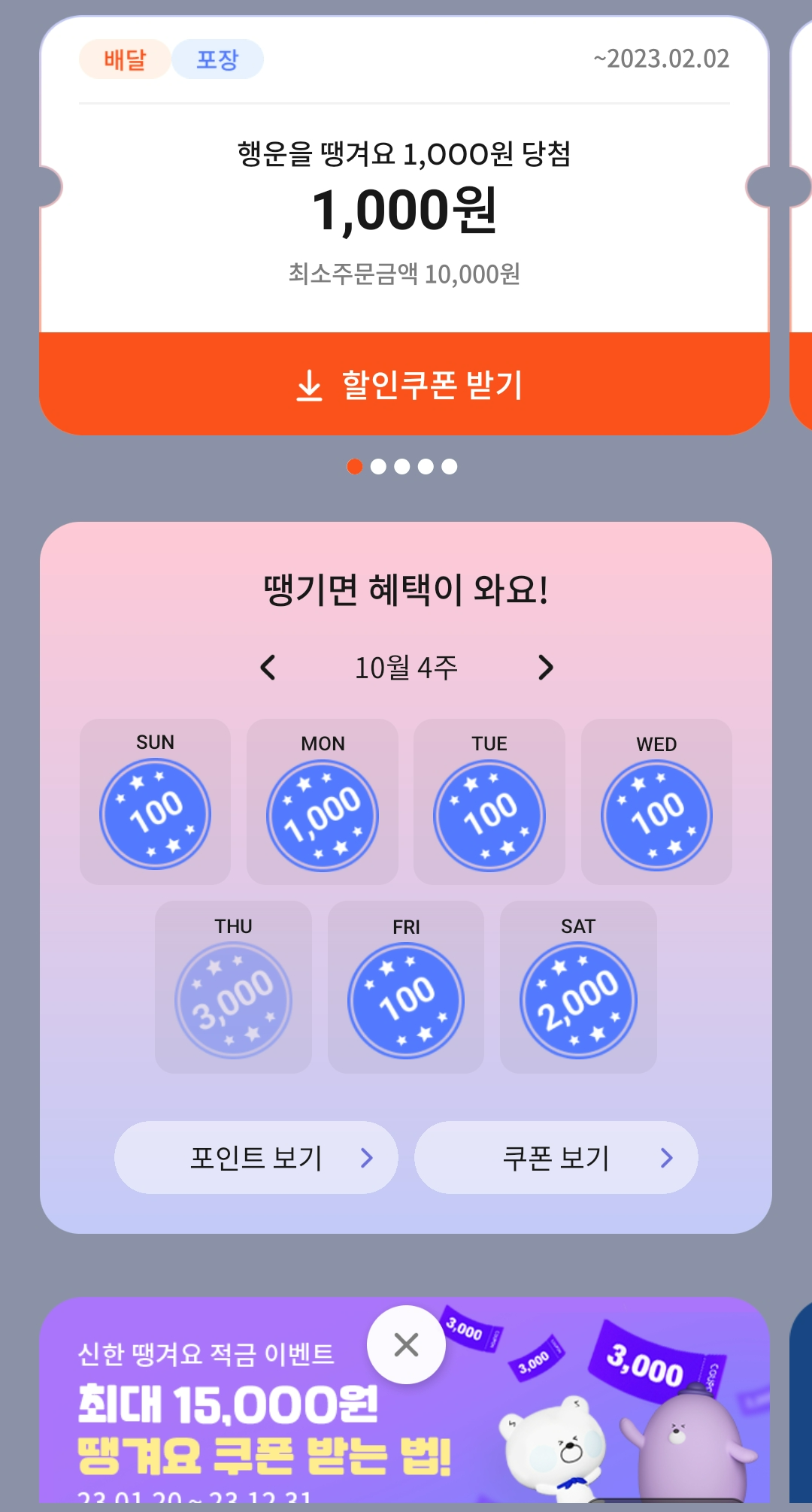 10월 4주 이후로 3천원 쿠폰 1번도 안 나왔고 100포인트 주는 것도 없어졌다.