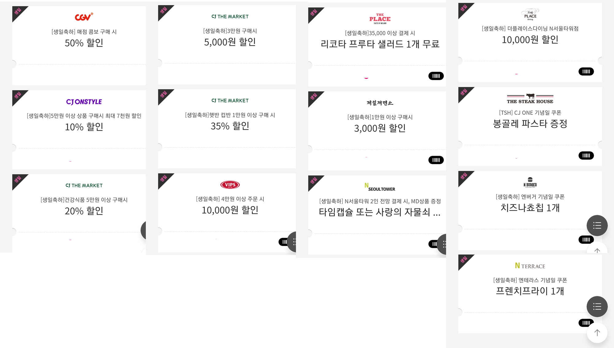 쿠폰은 CGV 매점 콤보 50% 할인, CJ 온스타일 할인, CJ 더마켓 할인, 빕스 4만원 이상 주문시 만 원 할인, 더플레이스 샐러드 1개 무료, 제일제면소 3,000원 할인, N서울타워, 더 스테이크하우스 봉골레 파스타 증정, 엔버거 치즈나쵸칩 1개, 앤테라스 프렌치프라이 쿠폰이 있다.