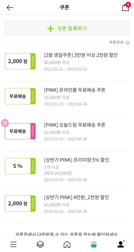 올리브영을 자주 이용하지 않았는데 쿠폰함을 보니까 핑크 올리브 등급에게 주는 쿠폰도 있었다.