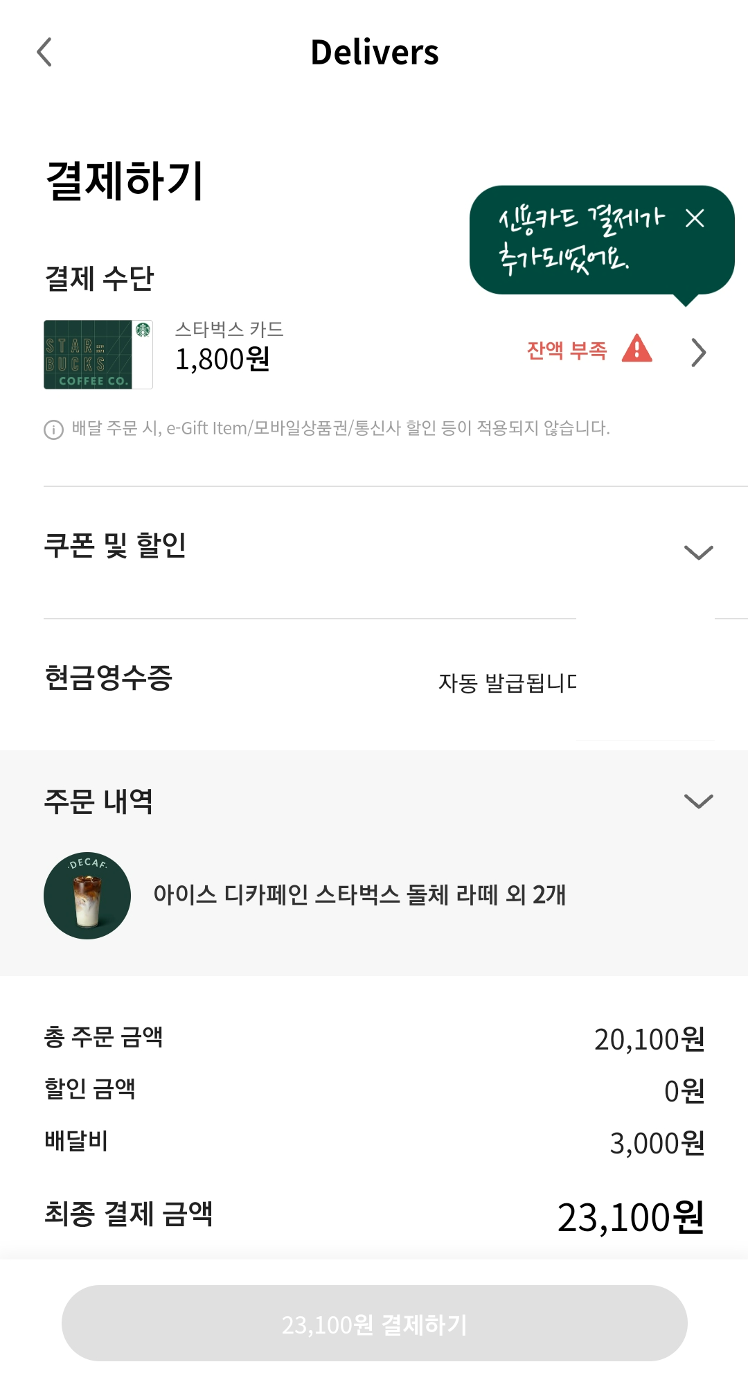스타벅스 배달 주문할 때 이 기프트 아이템, 모바일상품권, 통신사 할인이 안 된다.