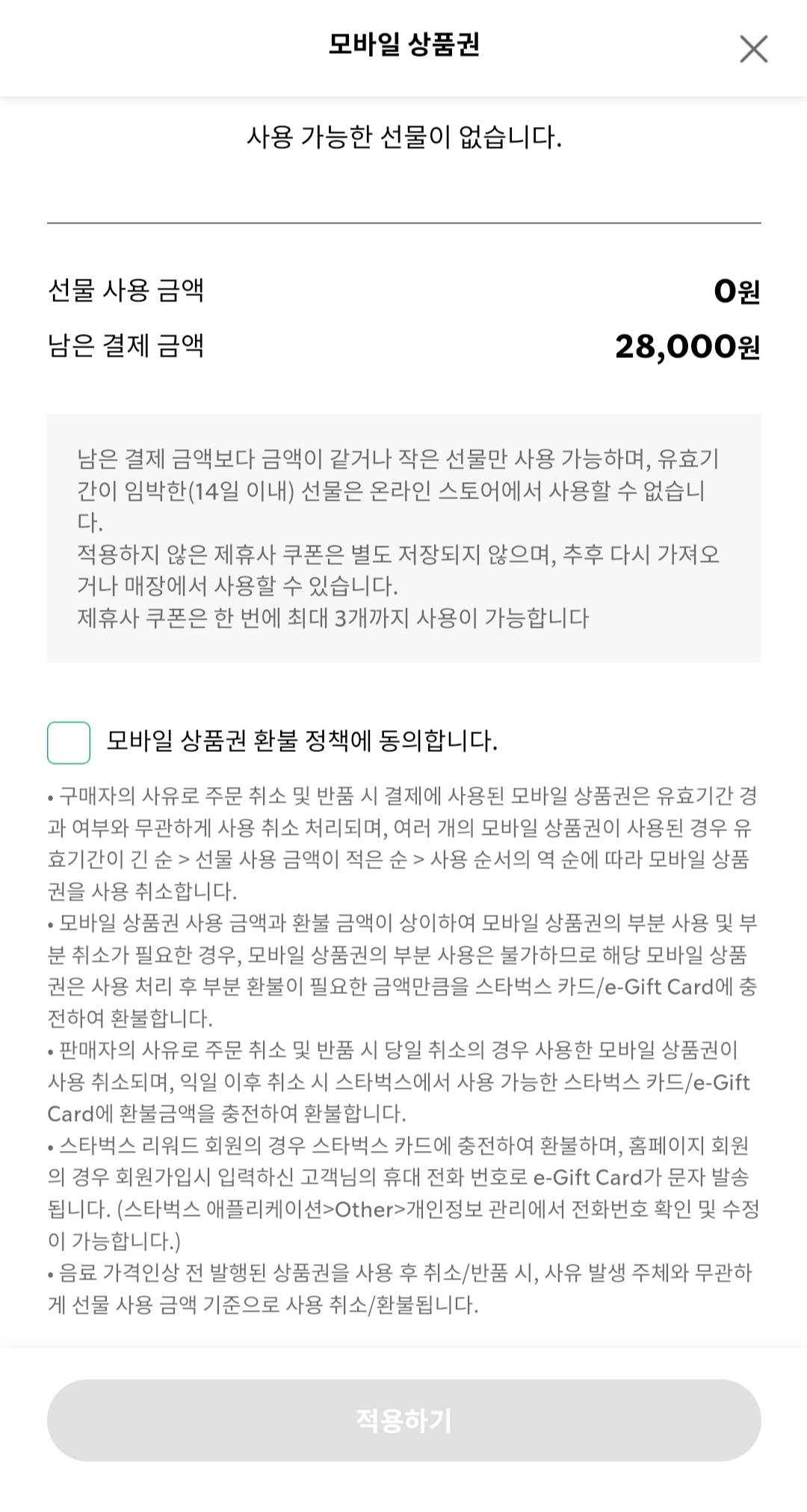 전에 사둔 거 다 쓰고 또 이기프트를 나에게 선물하기 하려고 했는데 없길래 이제 스벅 기프티콘은 다른 데서 사는 게 낫다.