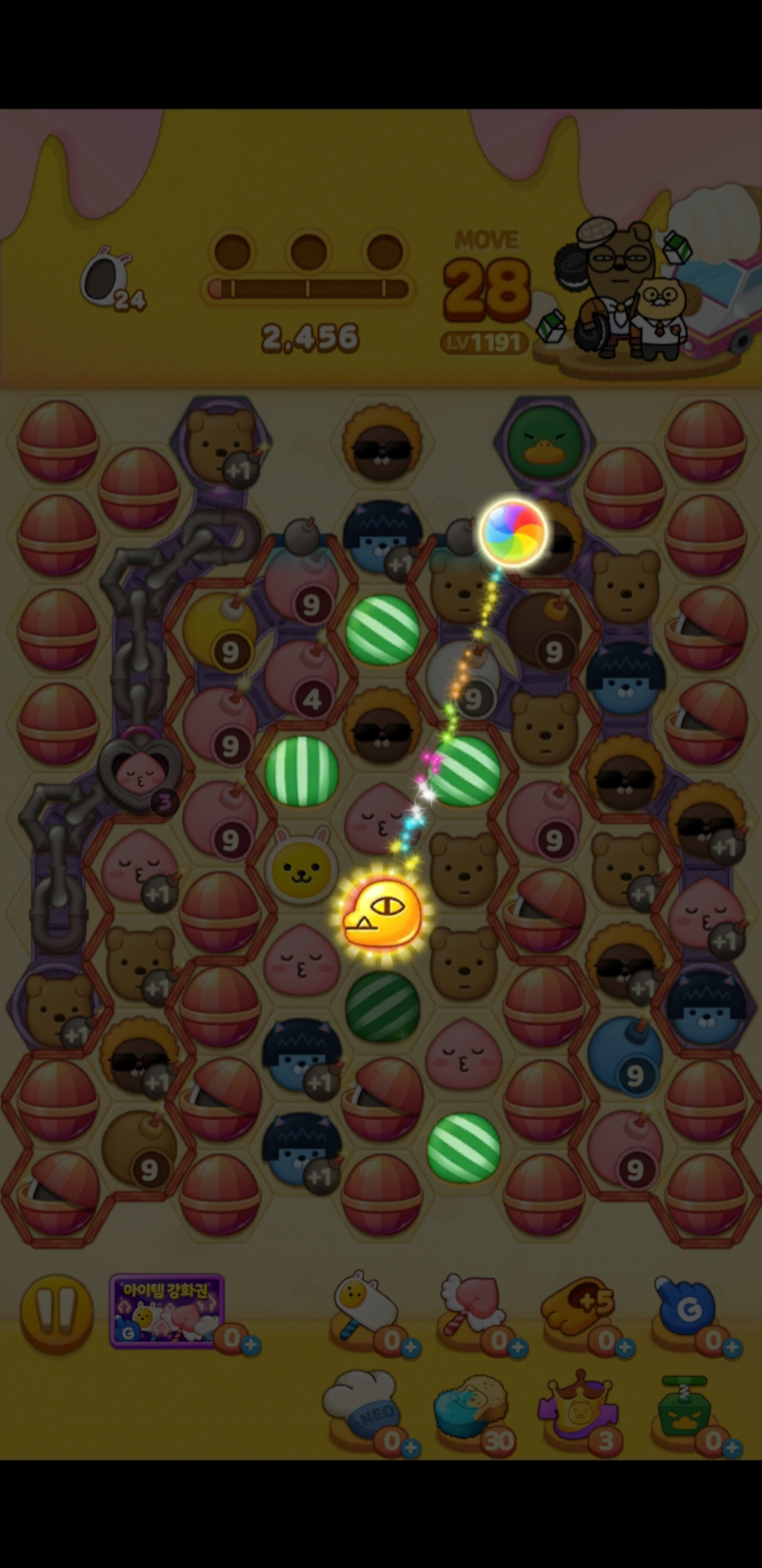 4개를 직선으로 모으면 줄무늬 아이템이 생기고 5개를 모으면 골드 콘이 생긴다.