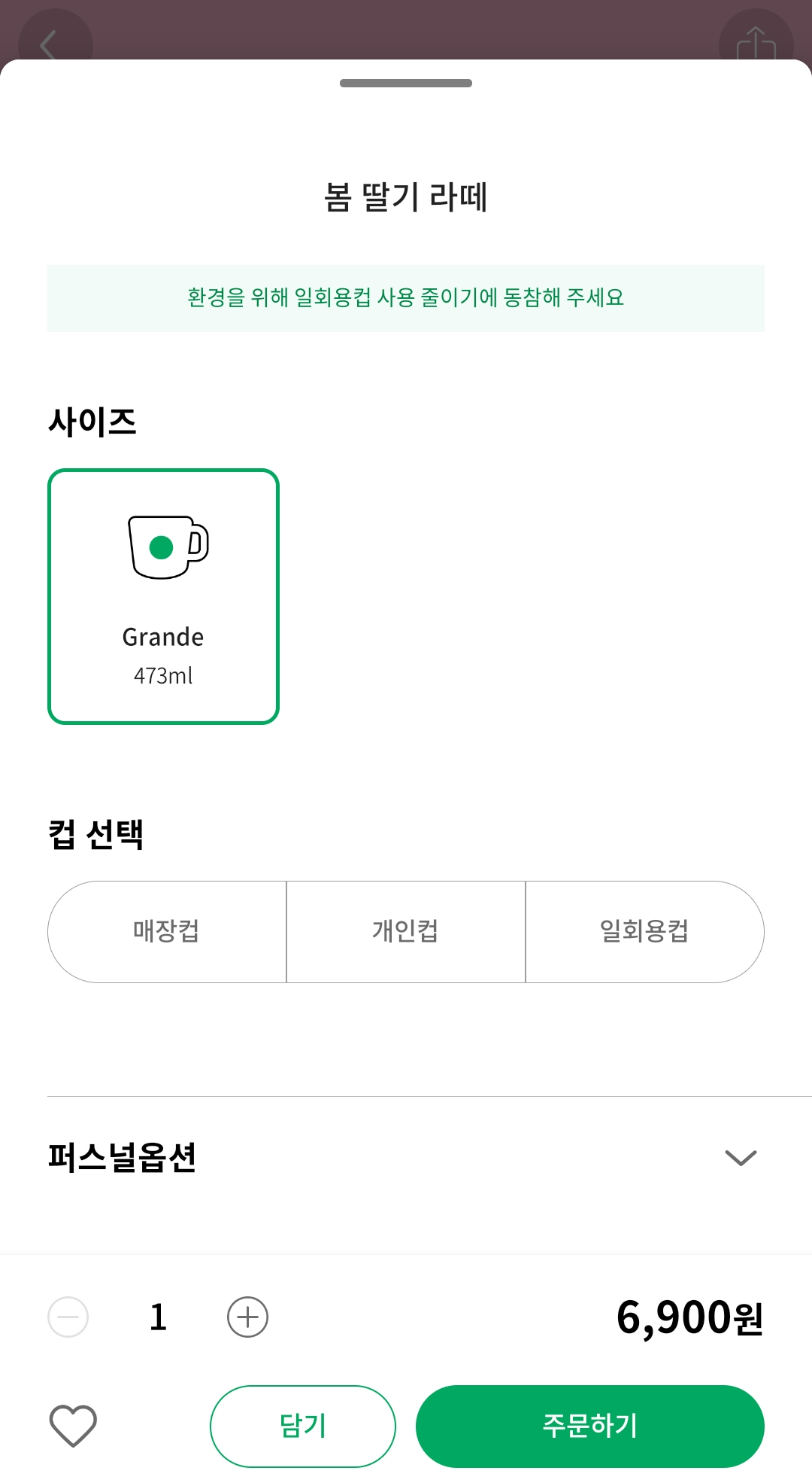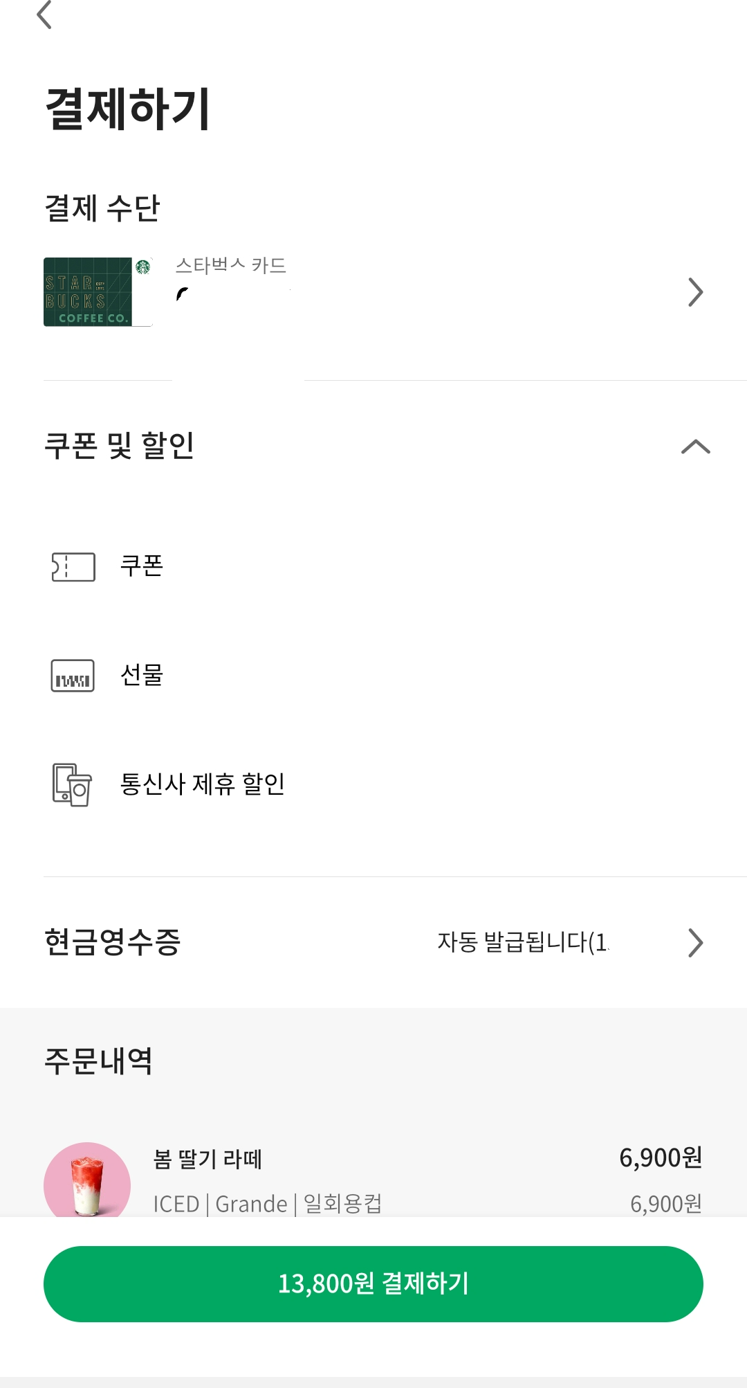 봄 딸기 라떼는 봄 한정 메뉴로 그란데 사이즈만 나오기 때문에 별 쿠폰이나 자동충전 보고쿠폰은 사용할 수가 없고 텀블러 음료 쿠폰만 된다.