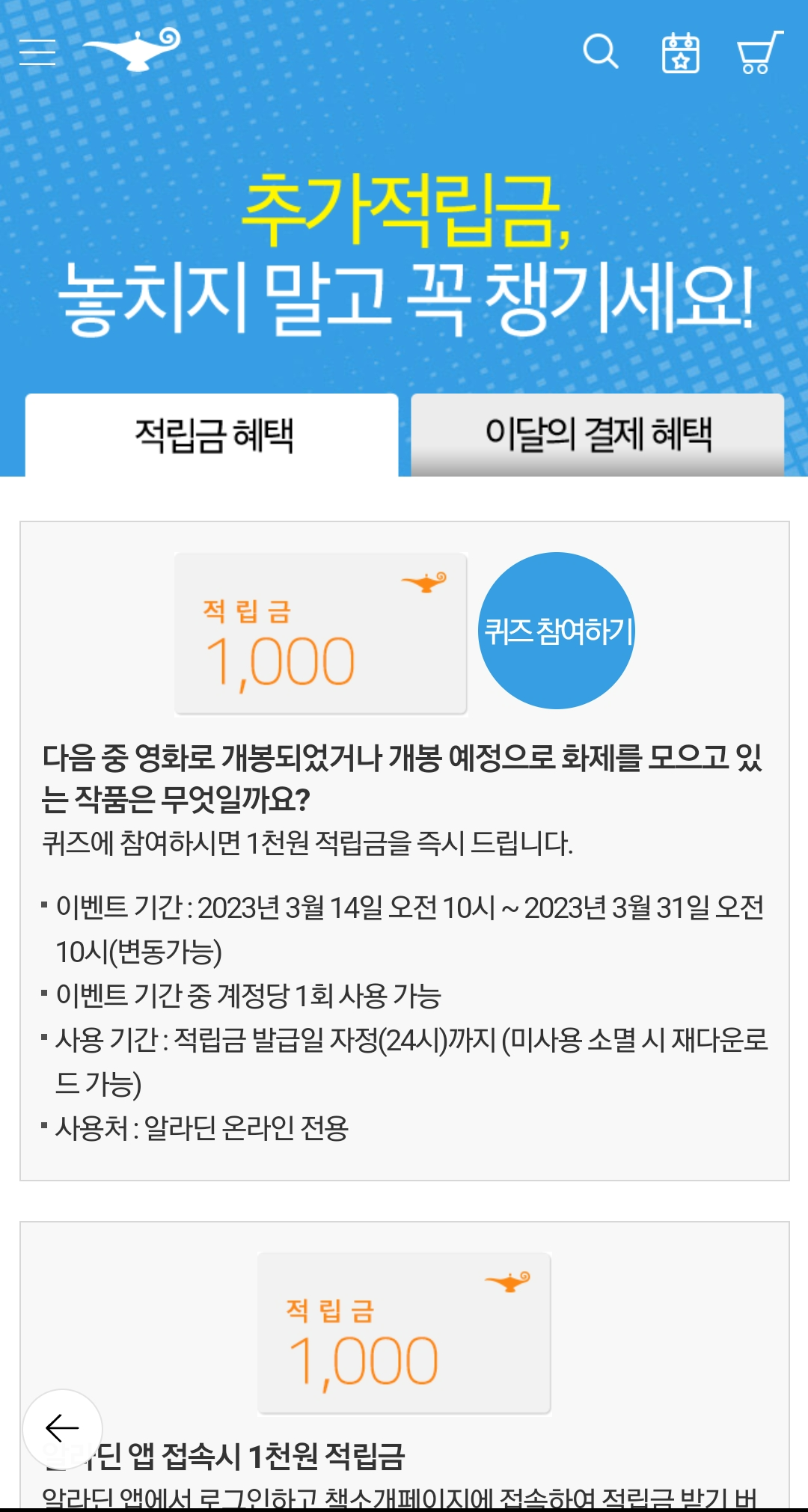 알라딘 추가 적립금은 퀴즈 참여하기를 하면 받을 수 있다.