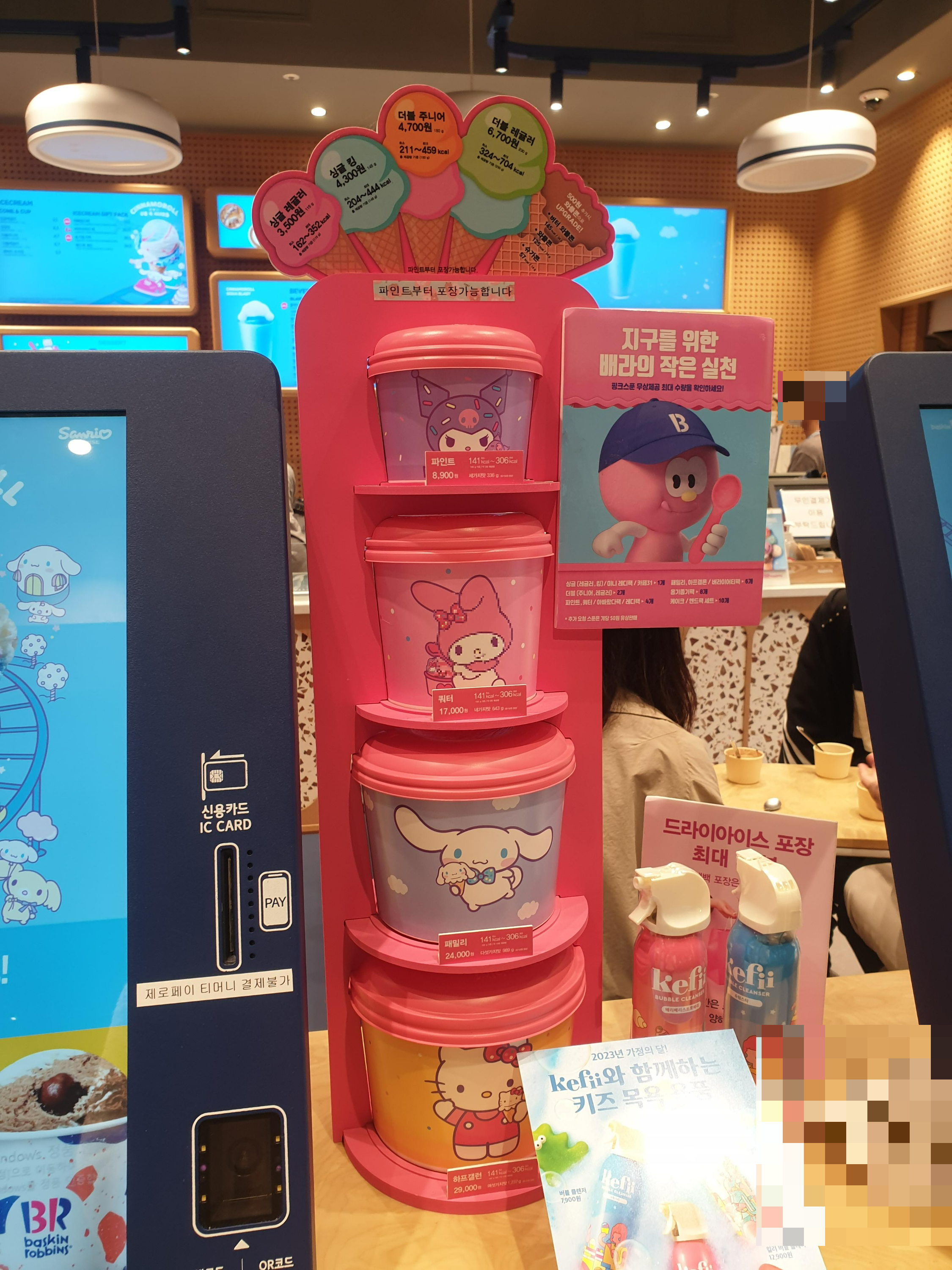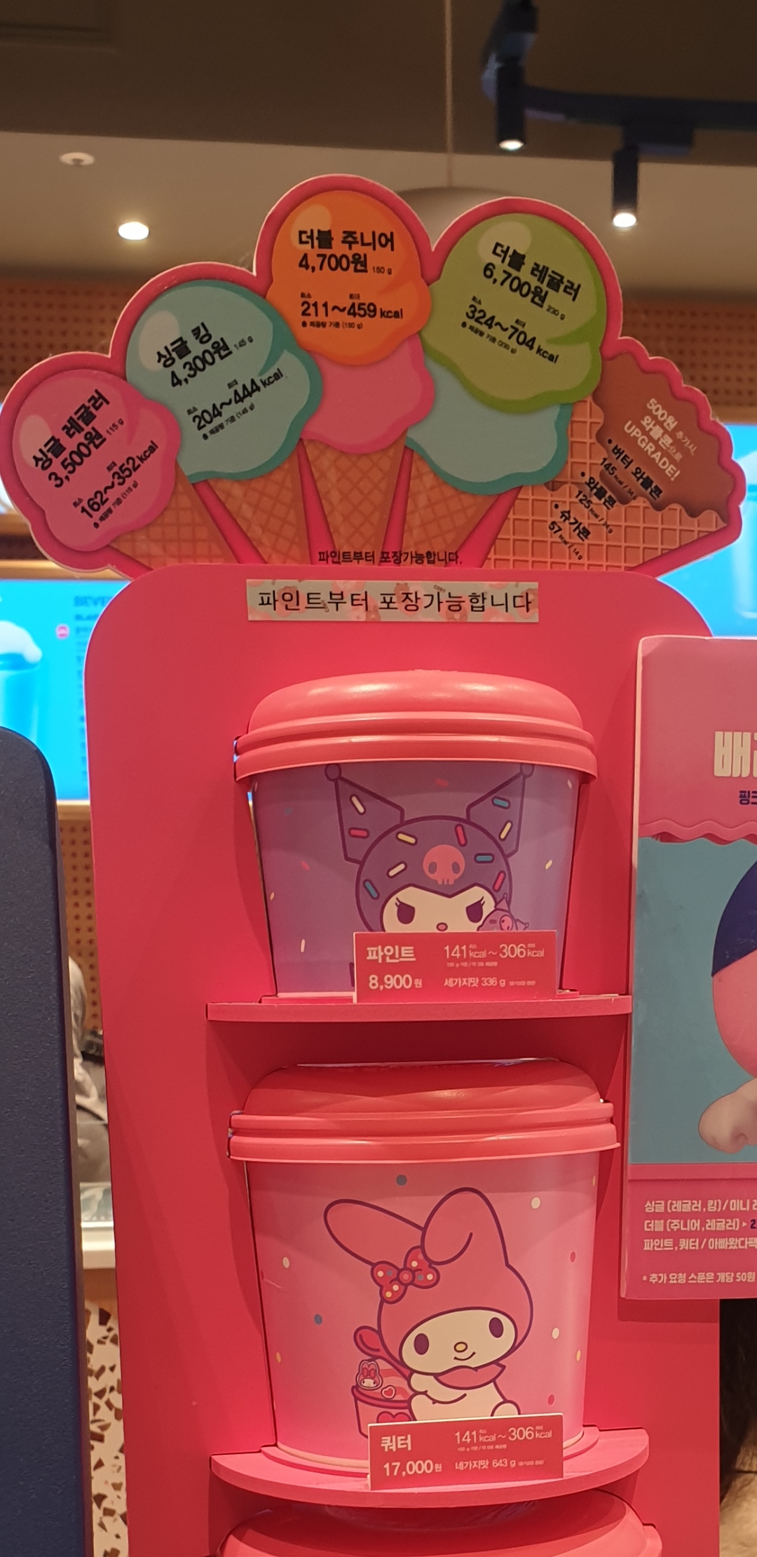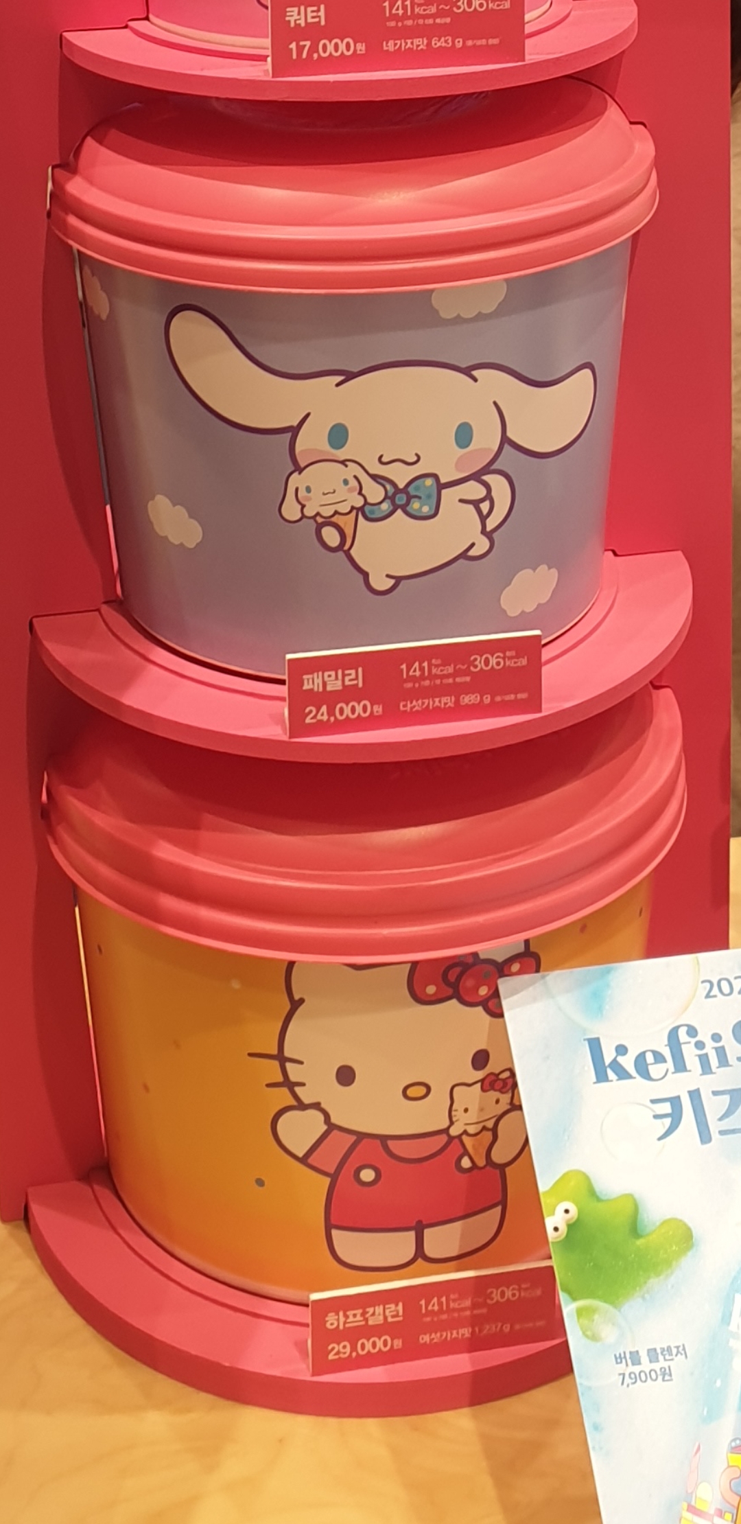 산리오 콜라보를 해서 아이스크림 용기도 산리오 캐릭터가 그려져있는데 파인트는 쿠로미, 쿼터는 마이멜로디, 패밀리는 시나모롤, 하프 갤런은 헬로키티가 그려져 있다.
