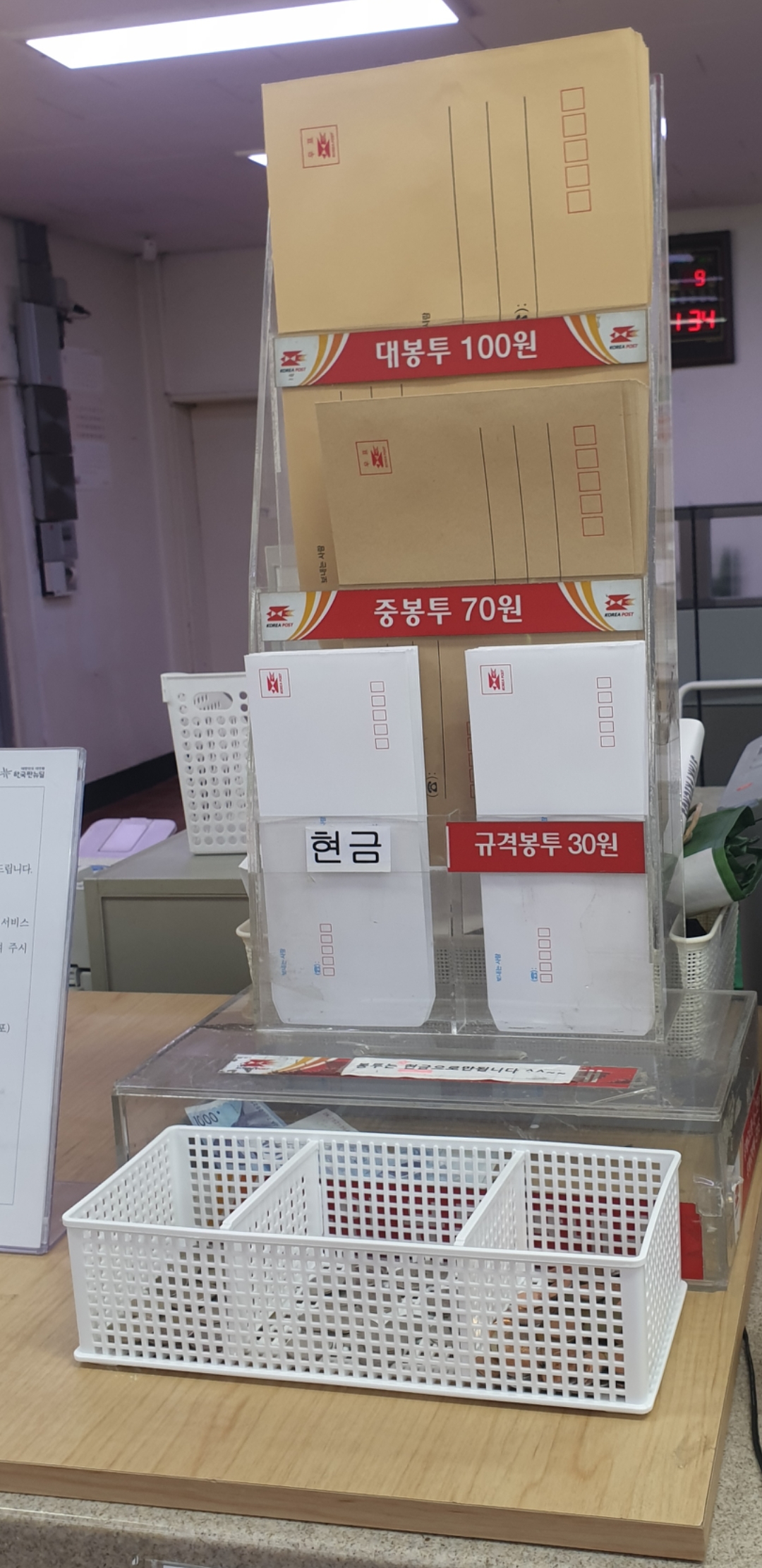 대봉투는 100원, 중봉투는 70원, 규격봉투는 30원이었는데 봉투는 현금으로만 결제가 된다고 되어있었다.