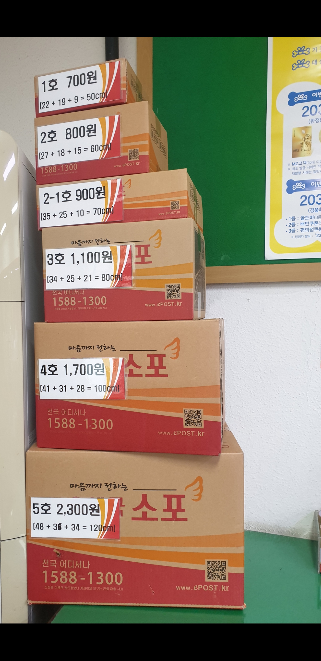 우체국에 팔고 있는 택배 상자는 1호, 2호, 2-1호, 3호,4호, 5호가 있다.