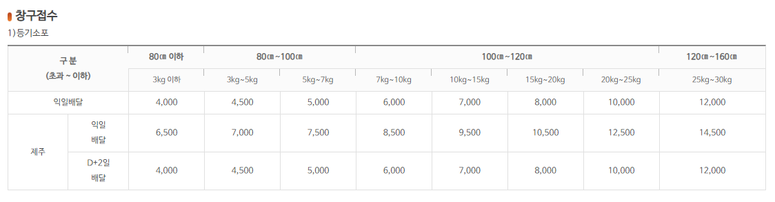 우체국 택배 요금은 중량과 크기에 따라서 결정되고 중량단계와 크기단계가 상이한 경우 높은 단계를 기준으로 요금이 나온다.