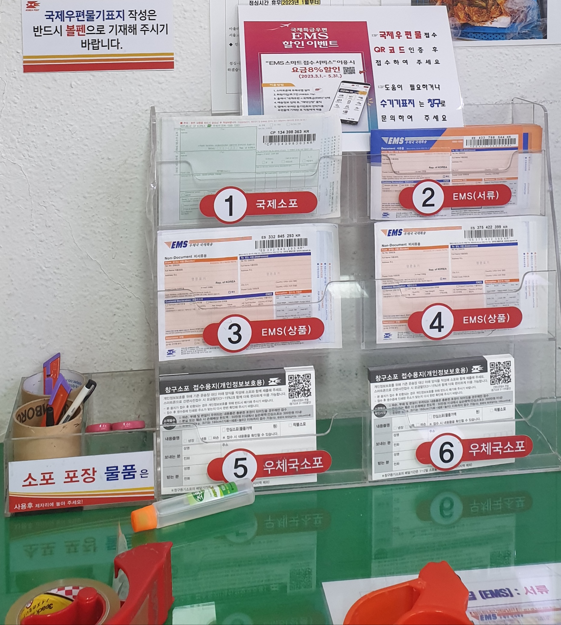 접수용지와 볼펜, 칼, 가위, 테이프, 물풀이 있어서 포장을 못했다면 여기서 하면 된다.