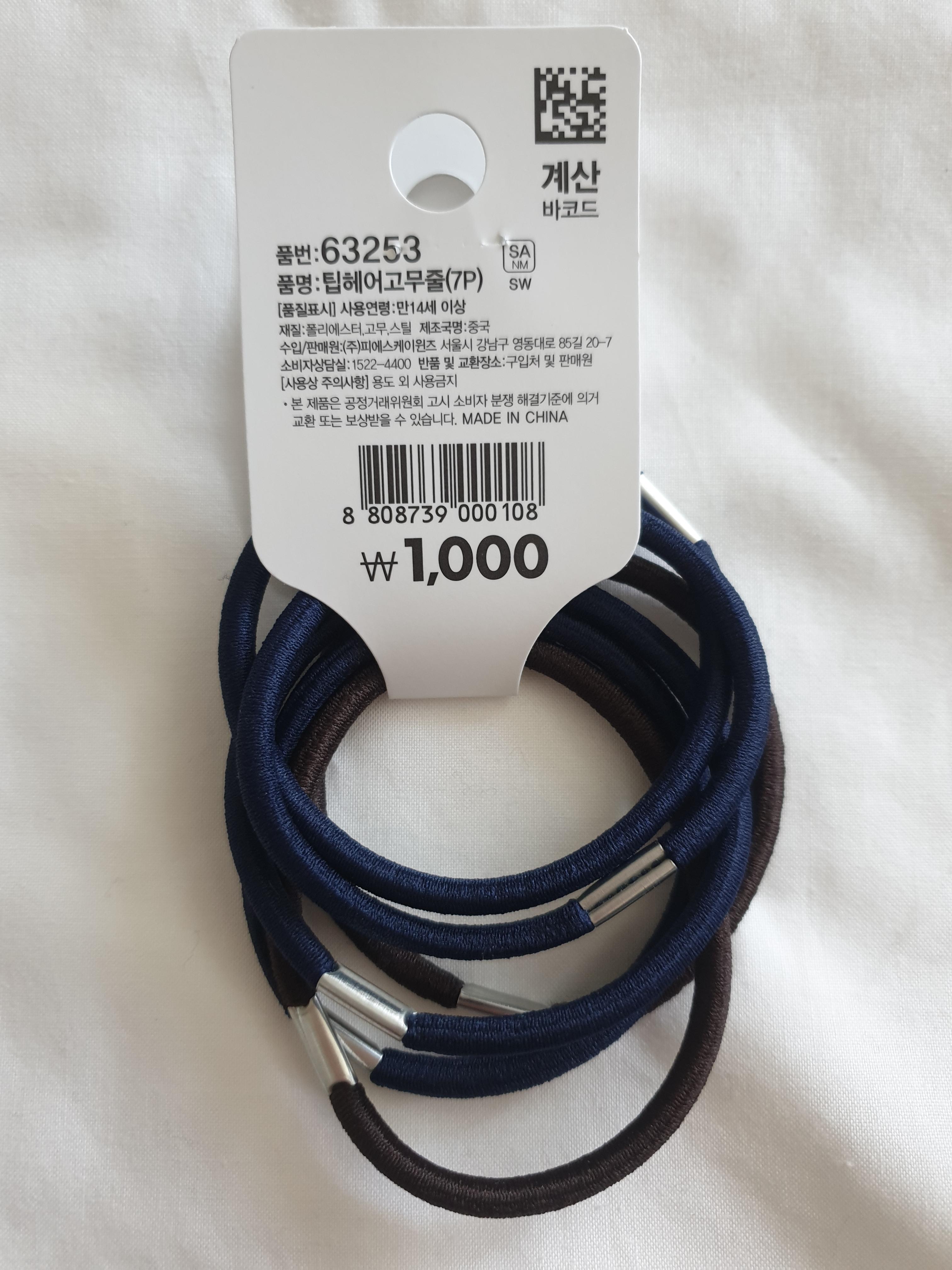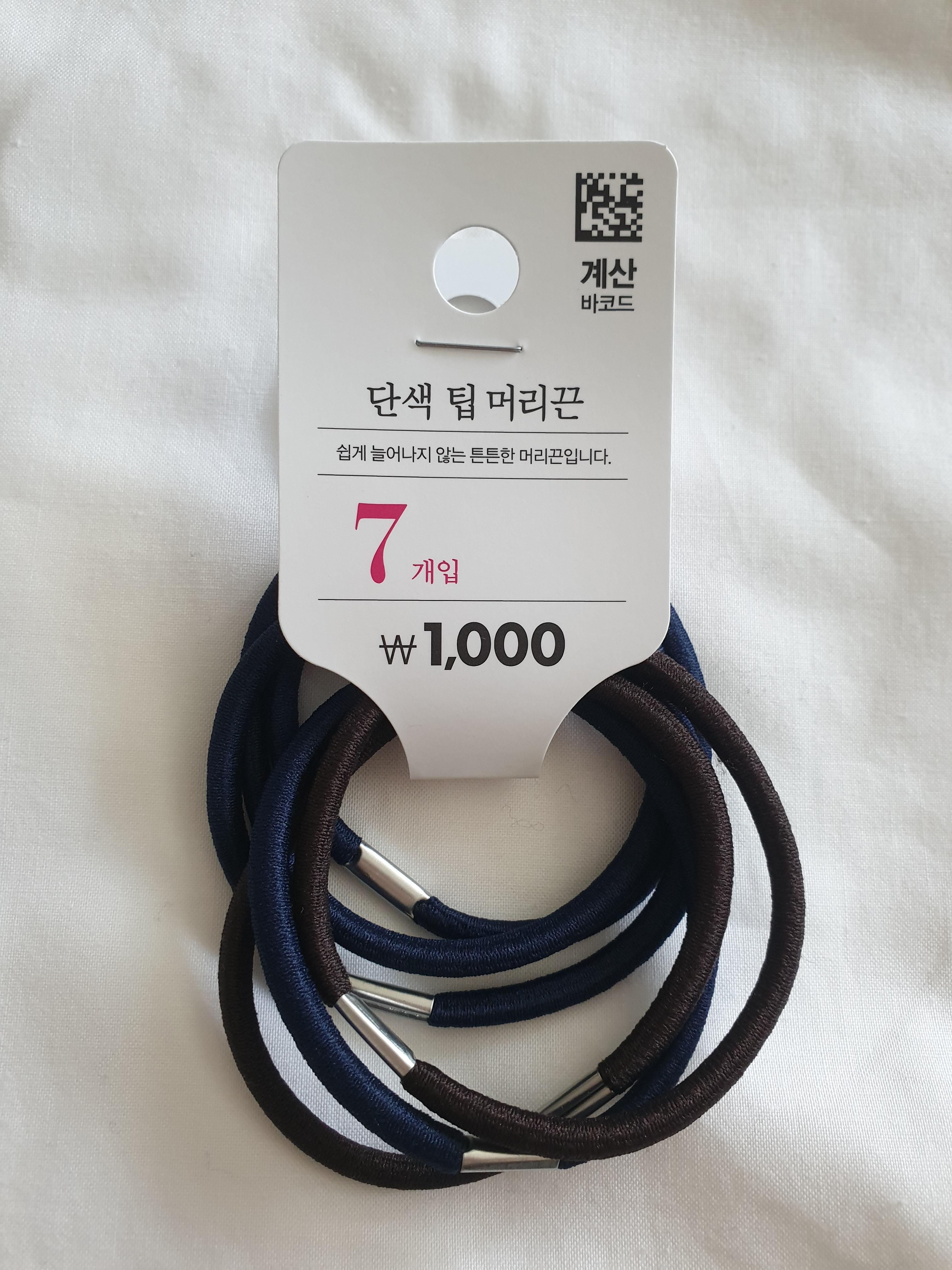 쉽게 늘어나지 않는 단색 팁 머리끈 7개입에 가격은 1,000원이다.