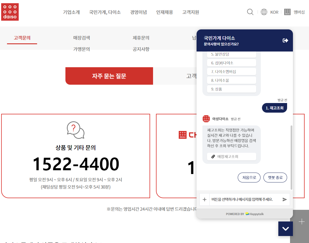 다이소 재고확인 방법은 인터넷으로 하면 된다. 다이소 사이트에 들어가서 챗봇을 열고 1. 재고조회를 선택하면 다이소 매장재고조회가 가능하다. 다이소 재고조회는 직영점만 가능하고 실시간 재고와 다를 수 있다.