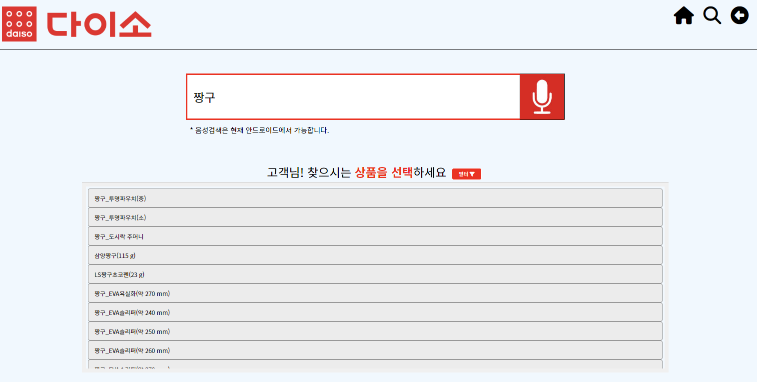 그리고 다이소 00점 재고조회 화면이 나온다. 여기서 검색창에 제품명, 품번을 입력하고 찾고 있는 상품을 선택하면 된다. 검색에서 음성인식도 된다는데 해보지는 않았다.