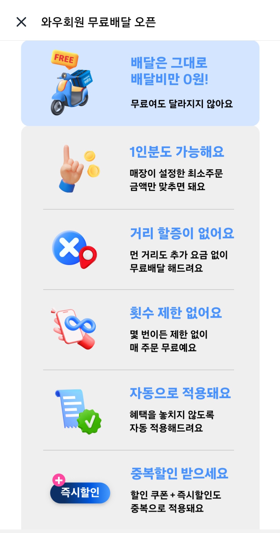 쿠팡이츠 와우회원 무료배달 공지 사항을 갈무리해 왔다. 쿠팡이츠 무료 배달은 1인분도 가능하고, 매장이 설정한 최소 주문금액만 맞추면 된다. 배달비는 0원이고 거리 할증 없고, 횟수 제한 없이 혜택이 자동으로 적용되고 중복할인도 된다.