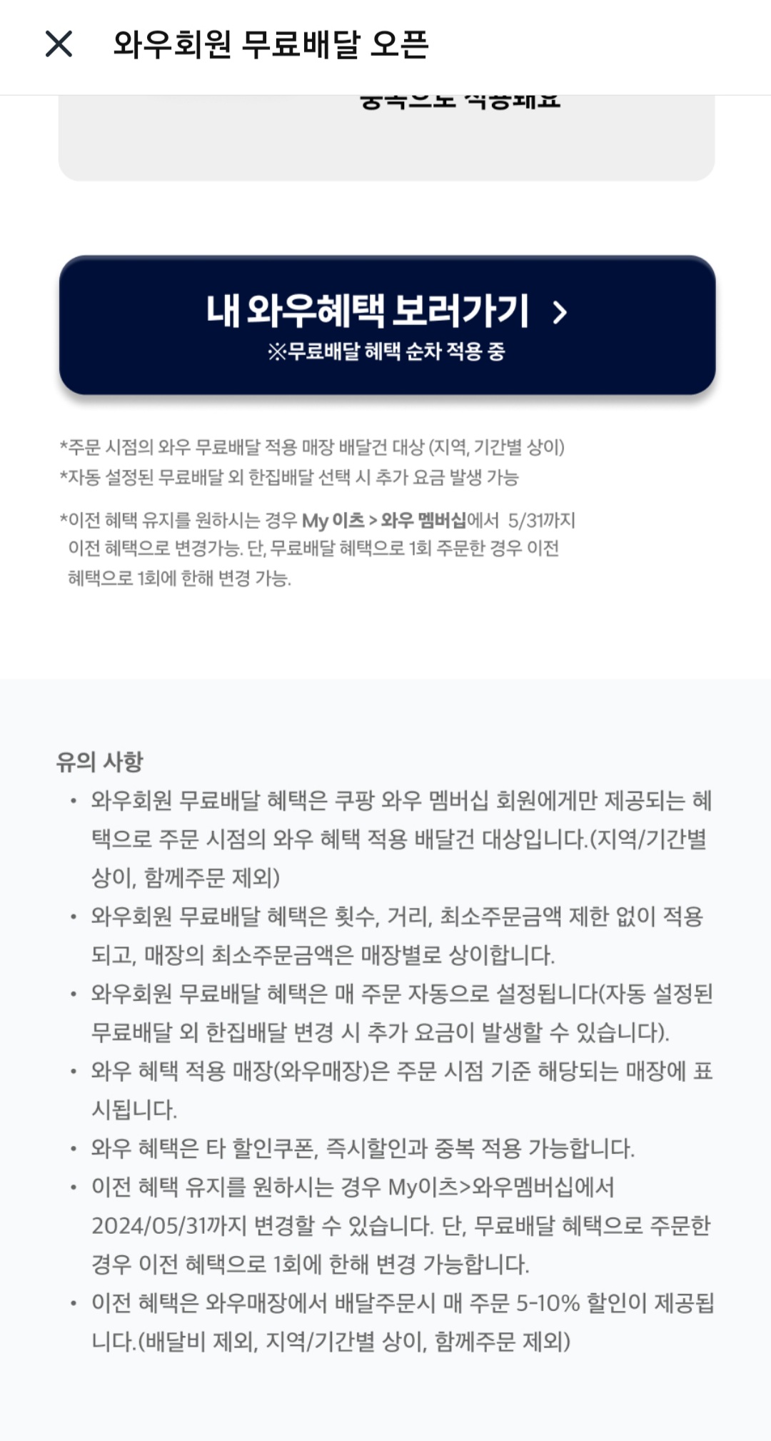 쿠팡이츠 무료 배달 공지사항에는 이전 혜택에 대한 유의사항이 있다. 이전 혜택은 와우 매장에서 배달 주문 시 매 주문 5~10% 할인이 제공되는 것인데 이전 혜택 유지를 원하는 경우 변경이 가능하다.